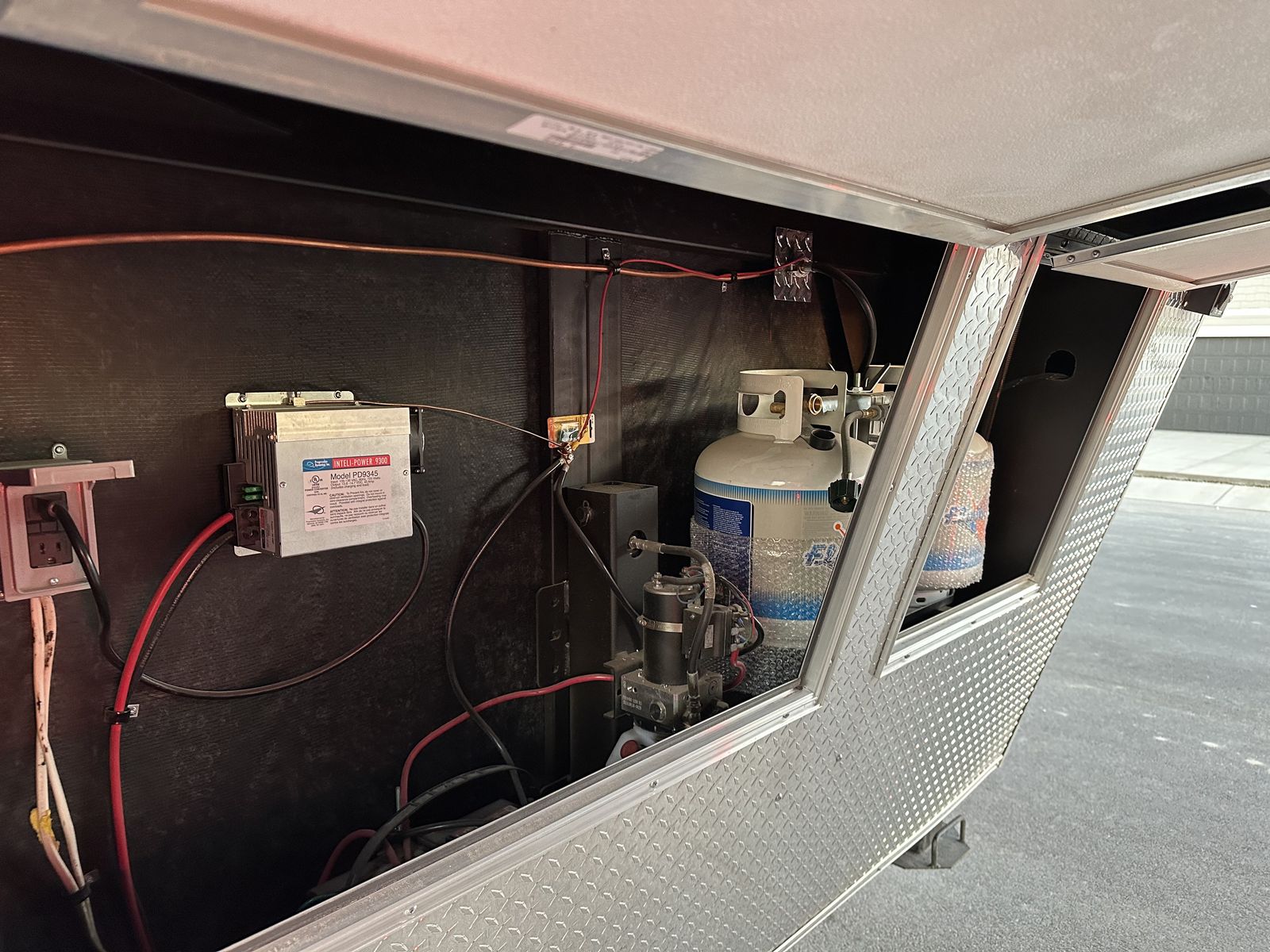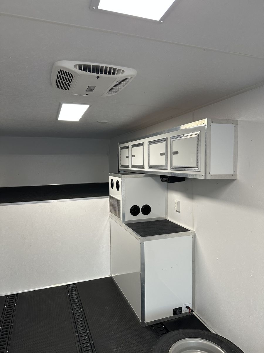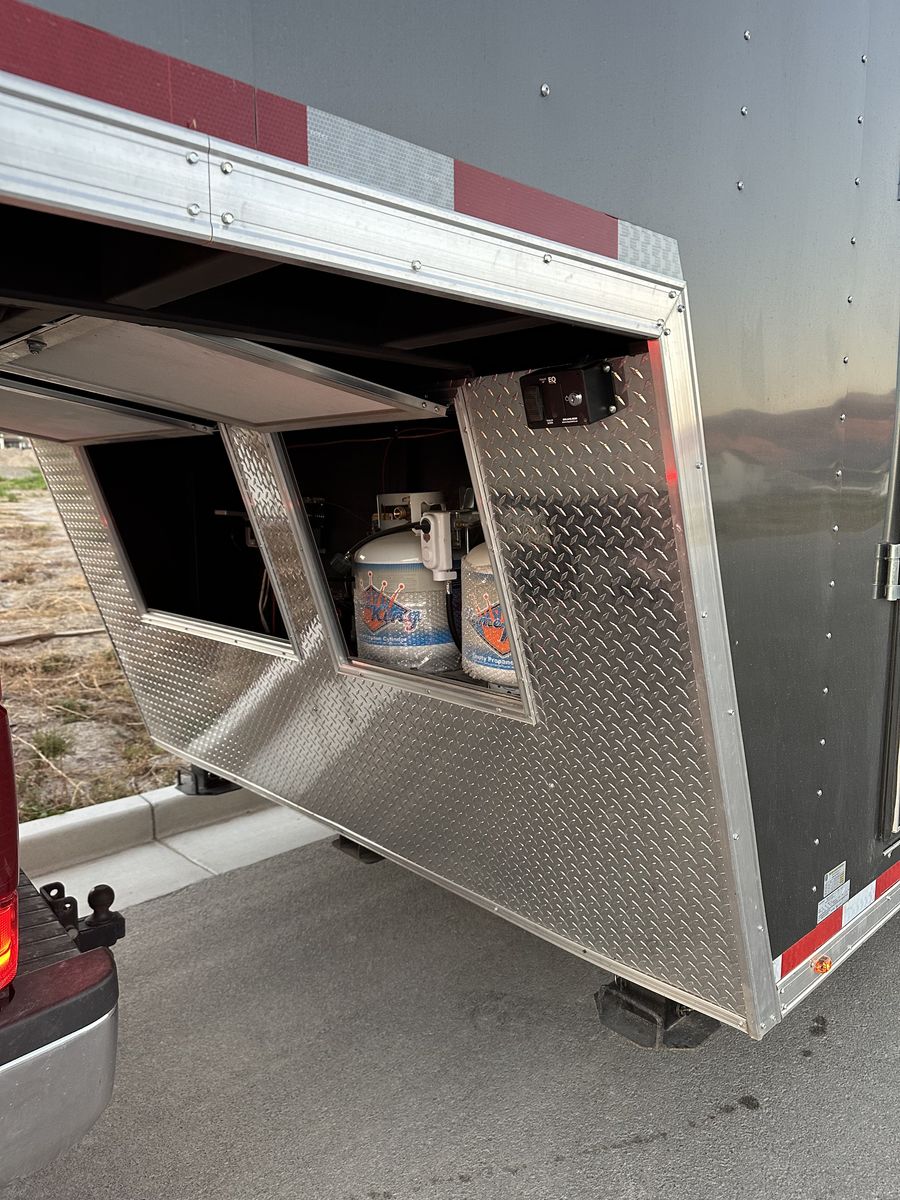 For climate and comfort, the trailer is equipped with a 40,000 BTU heater with two brand-new propane tanks, a 15,000 BTU air conditioner with thermostat, overhead cabinets (16"), a generator compartment, and both CO₂ and smoke detectors. There is also a Bluetooth stereo with speakers.