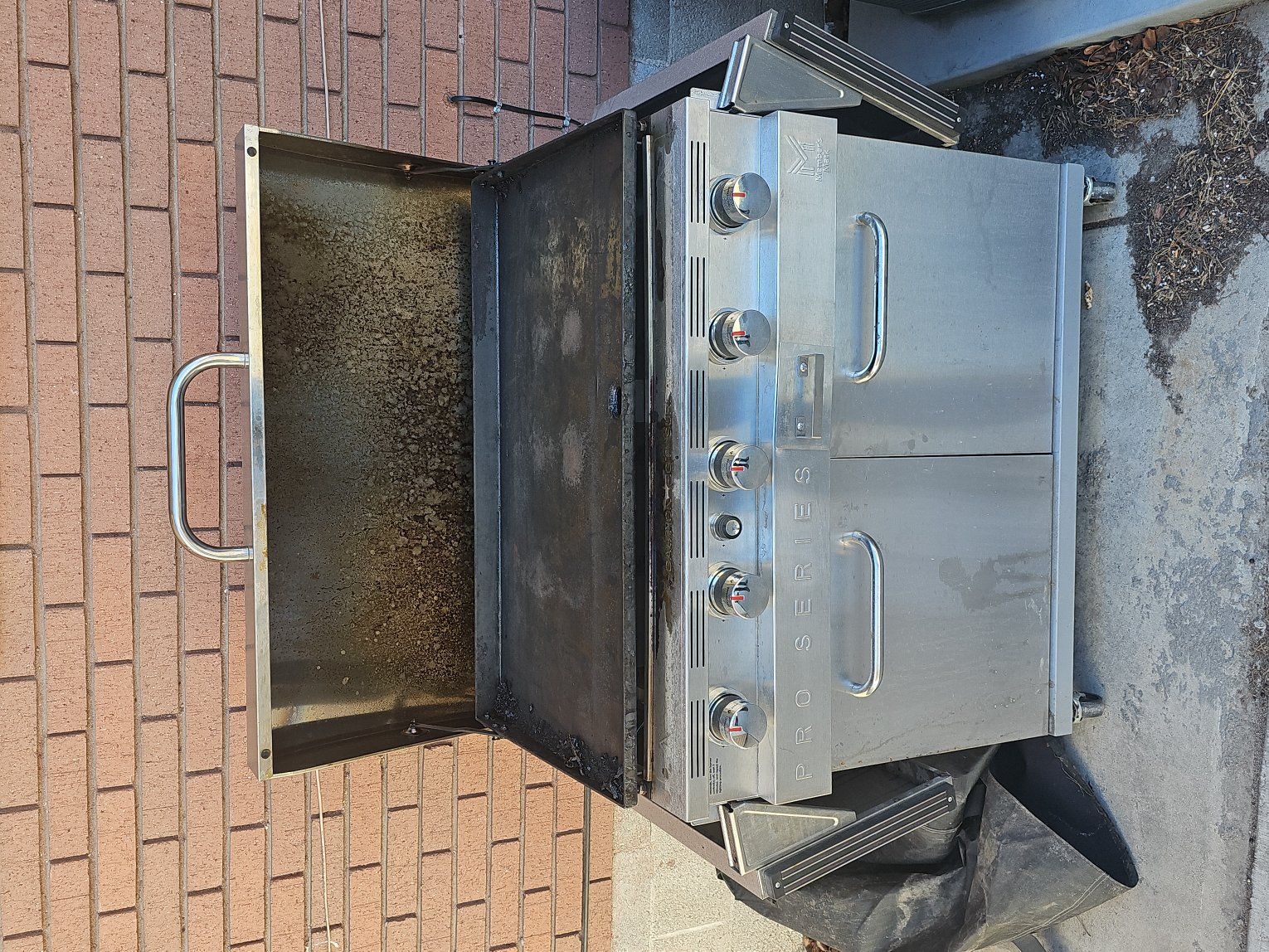 Works just like if not better than a black stone. Used less than 10 times. Small little dent by grease trap door but does not effect it at all. I have the cover. Works excellent. Just needs a clean. I just dont use it as much as I thought and prefer my smoker more. 375.00 obo