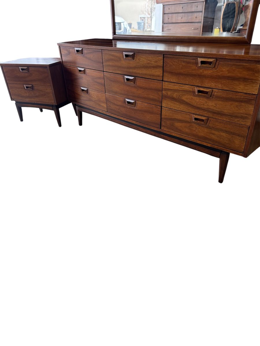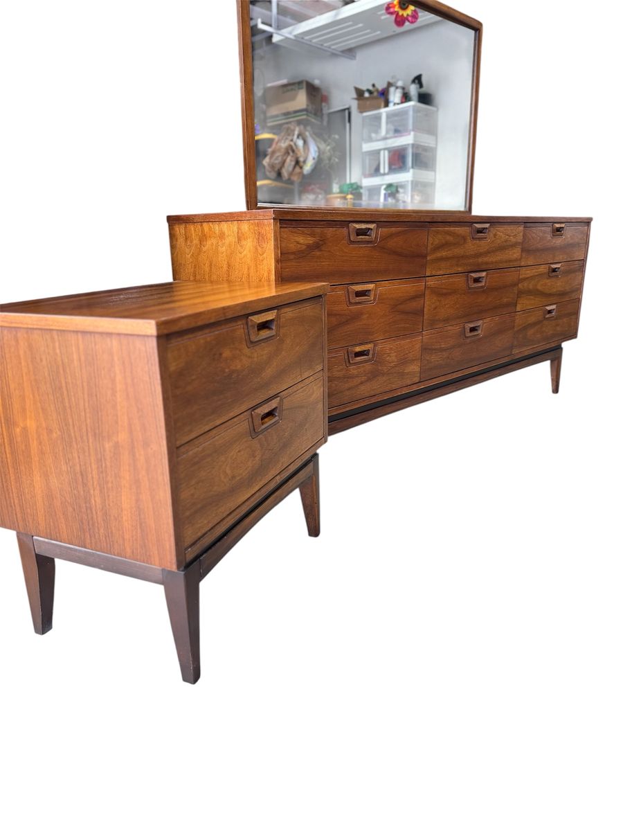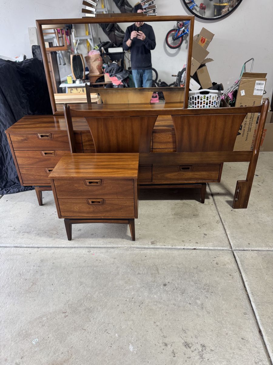 Mid Century Modern Walnut Bedroom Set – JB Van Sciver Style – Dresser, Mirror, Nightstand & Full/Queen Headboard