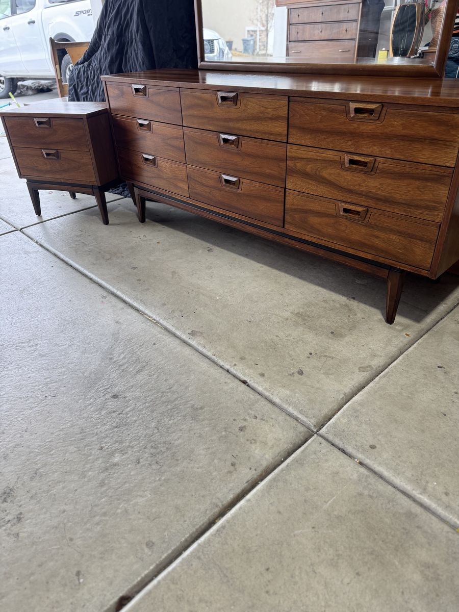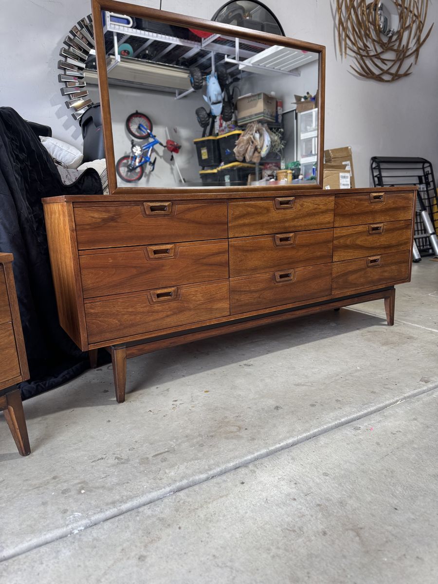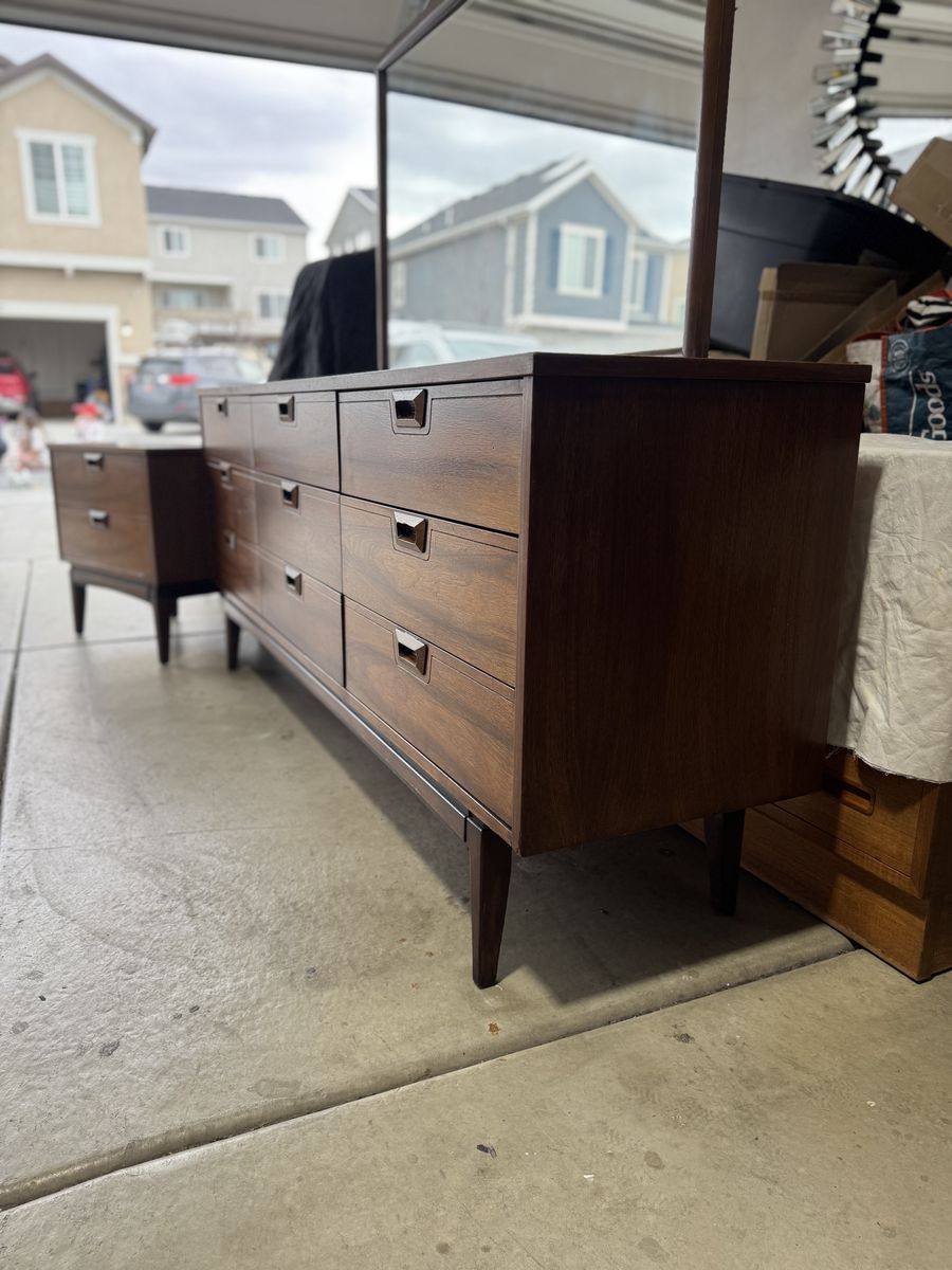Mid Century Modern Walnut Bedroom Set – JB Van Sciver Style – Dresser, Mirror, Nightstand & Full/Queen Headboard