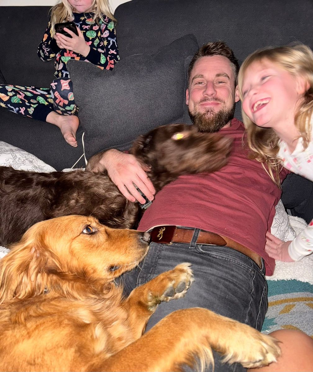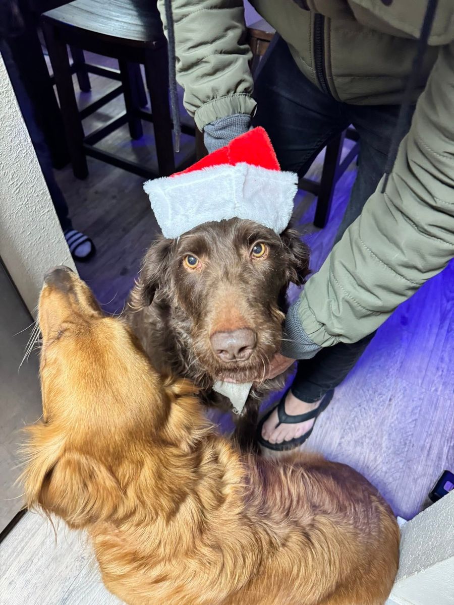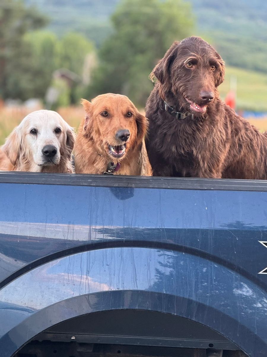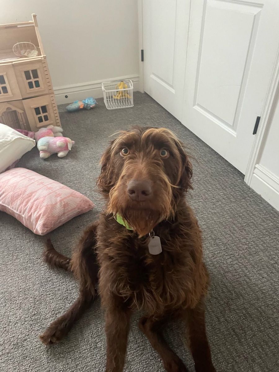 • 60 lb chocolate Labradoodle • Calm, smart, very well-trained • Runs trails, plays fetch, loves to cuddle • Confident, steady personality