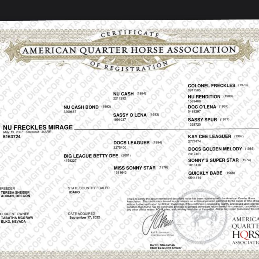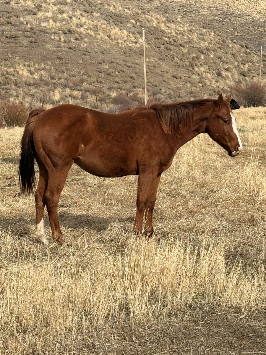 Nu Freckles Mirage is an open 2007 soggy broodmare. I bought her at the Reno snaffle bit futurity in 2022, bred her with cooled semen 2023 ( took first try). I was going to breed her again in 2024, but she injured herself and I didn’t feel it was fair to her. 2025 got away from me and she didn’t get bred again. If she doesn’t sell I will breed her myself this year. She’s too nice of a mare and produces outstanding foals not to. If interested please call/text/message do not email.