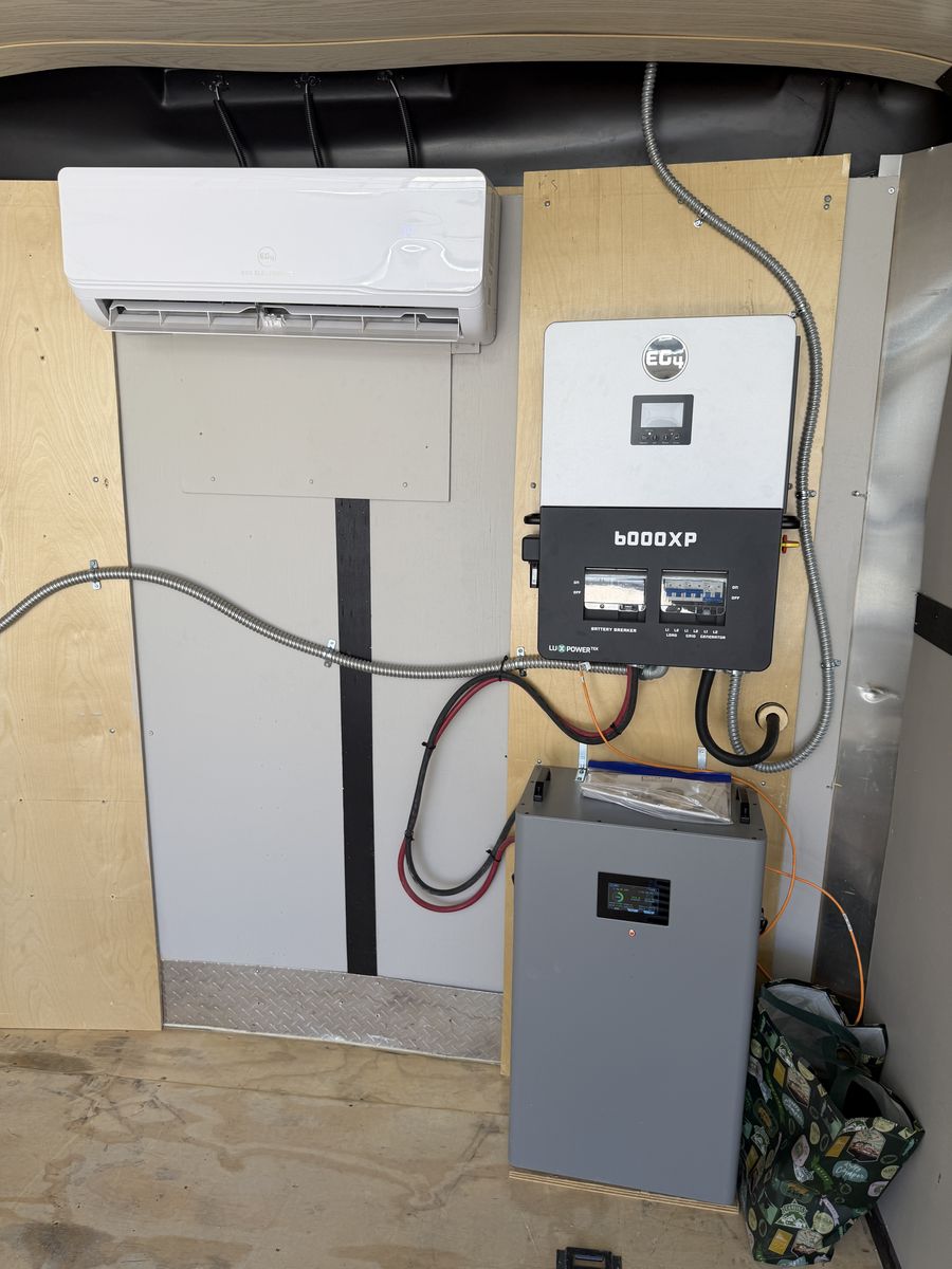 • Efficient Climate Control: 12,000 BTU mini-split air conditioner + heat pump — runs directly on solar/battery power or 120V AC. Super efficient for cooling/heating the interior without a noisy generator.