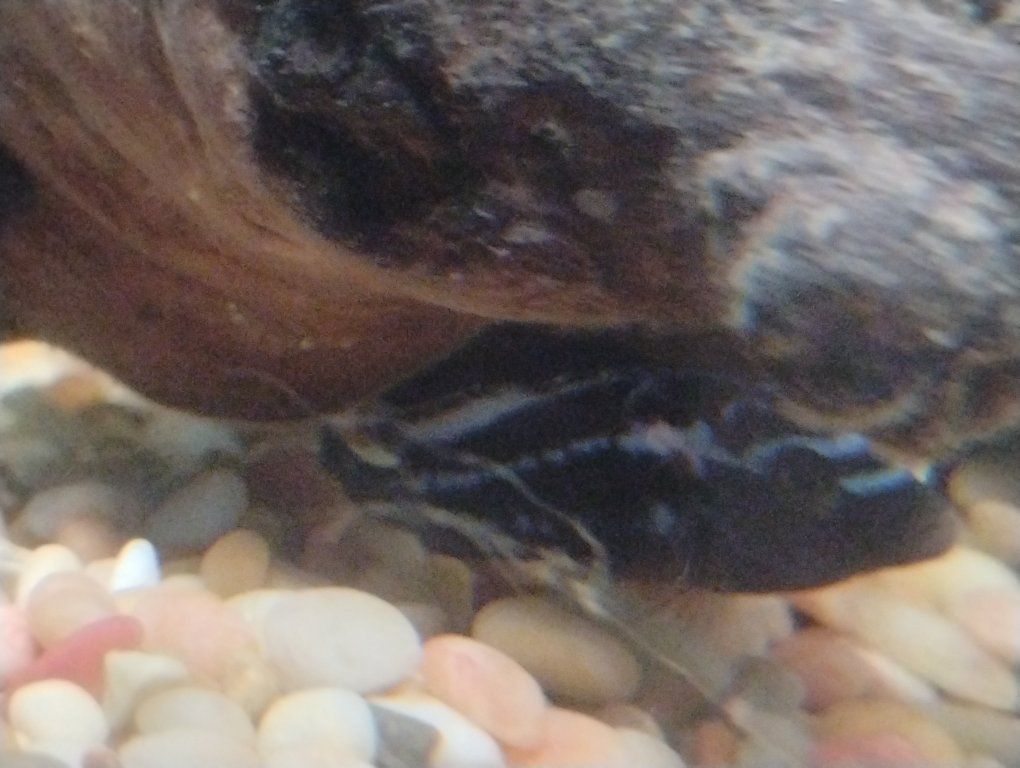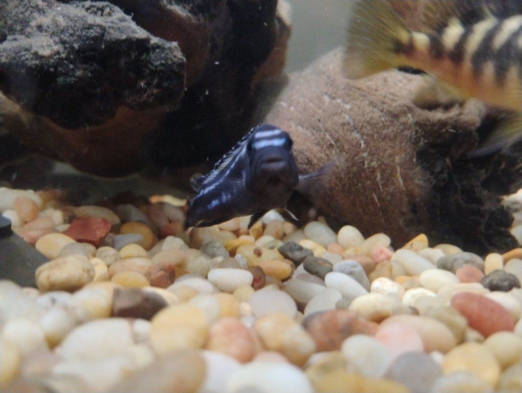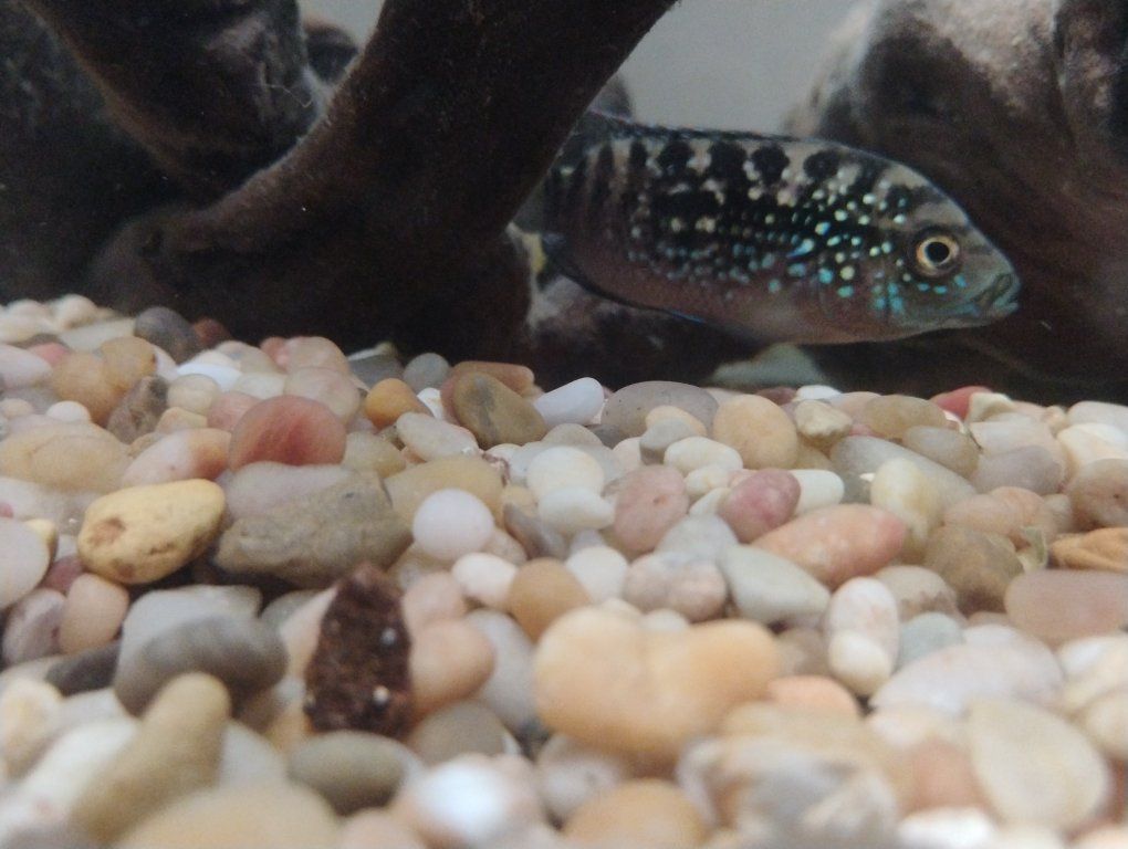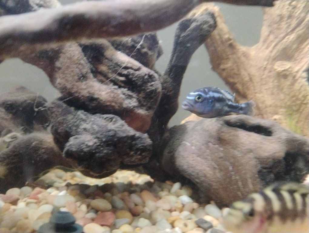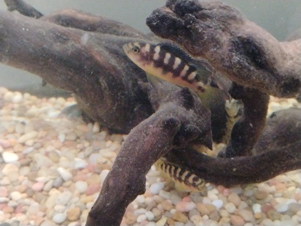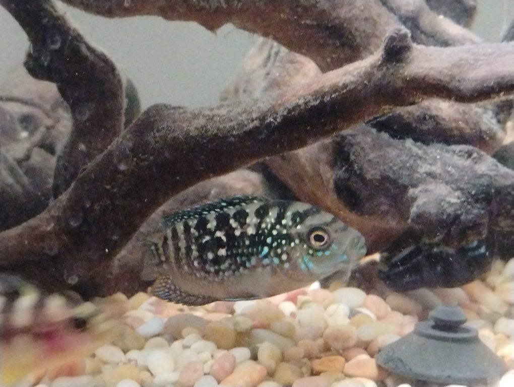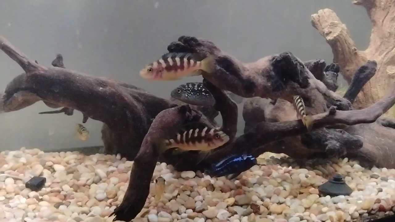 one Jack Dempsey, one electric blue jahanni and seven juvenile Bumblebee cichlids.