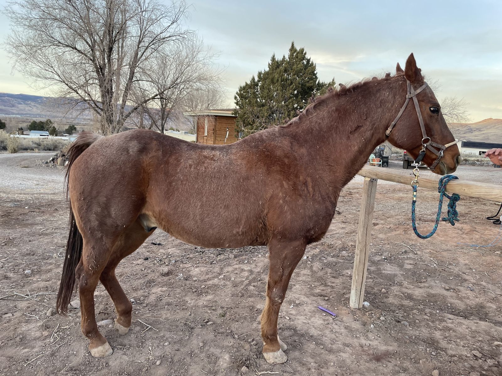 a chestnut roan gelding. He’s done trails, ranch work, carried buffalo and elk. has woah and Go despite his old age. We were told he’s 18. we don’t know a whole lot about his history. Very loving, stands for farrier. Dang near completely desensitized. He is a bit mare sour but someone with the right knowledge can definitely fix that. Asking 1k- price negotiable