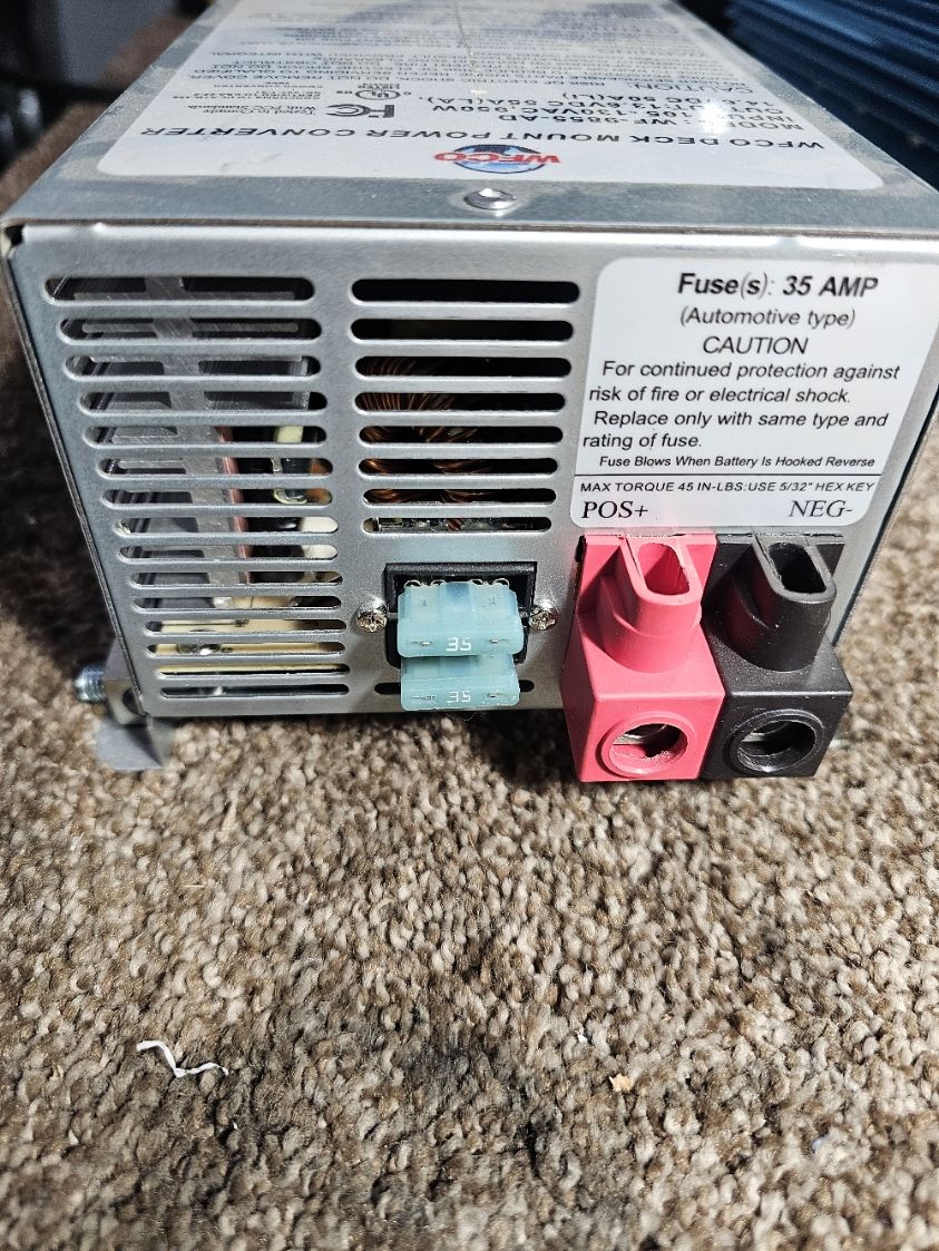 WFCO auto detect deck mount power converter model WF-9855-AD. This unit version works with both lithium and lead acid batteries. Unit is basically new, pulled out of brand new coach as it had a large solar system installed and this was not needed.