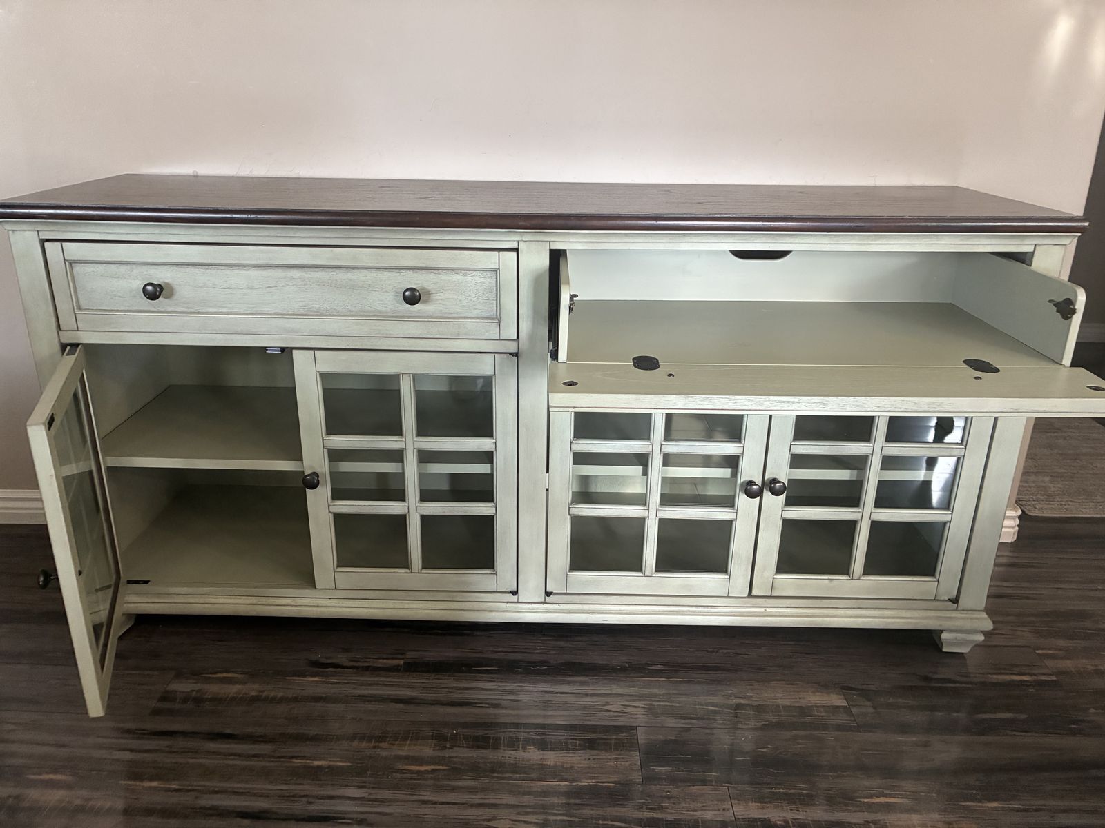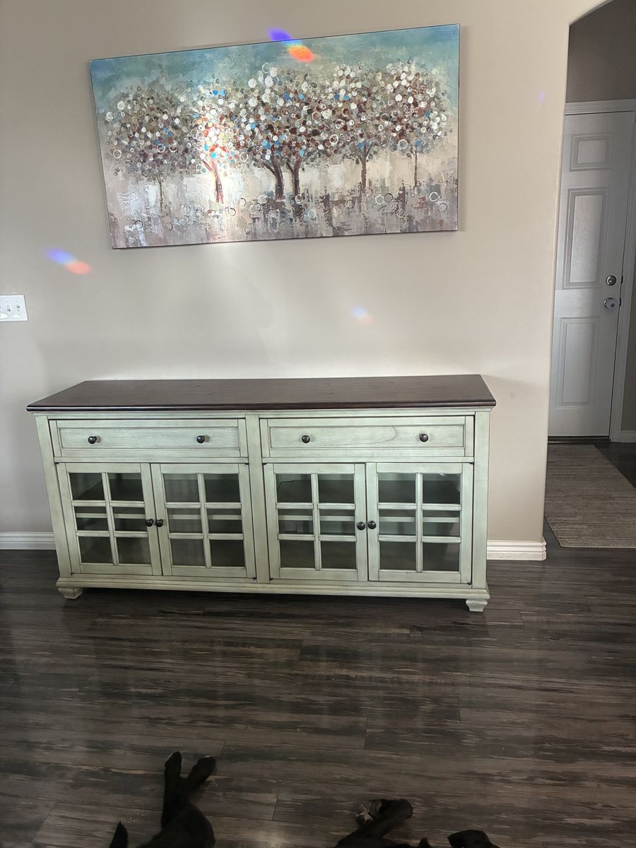 GooglePayTwo drawer. Both pull out or pull open. a little wear on the top mahogany stain and a couple of small spots in the drawers. Can be used as buffet, side table or tv console. In great condition. It's 68 in wide, 32.5 inches tall and 18 inches deep. Must be able to pick up.