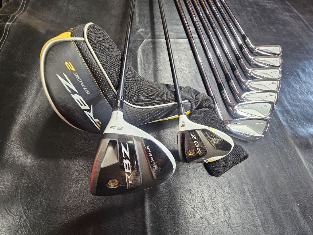 Full Mizuno MP-64 Set with TaylorMade Driver, 3 wood, Nike stand bag.