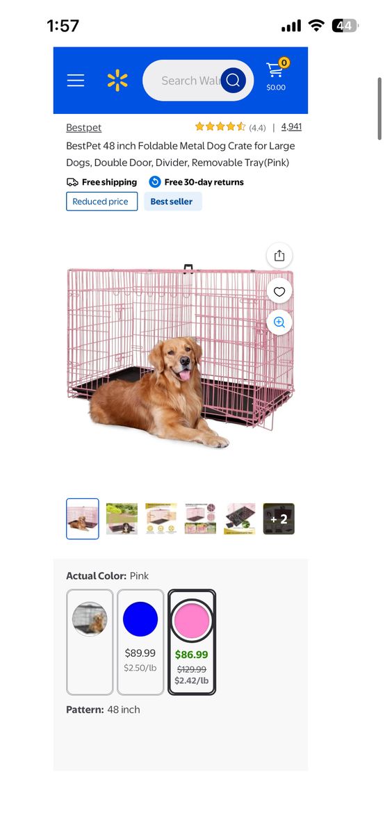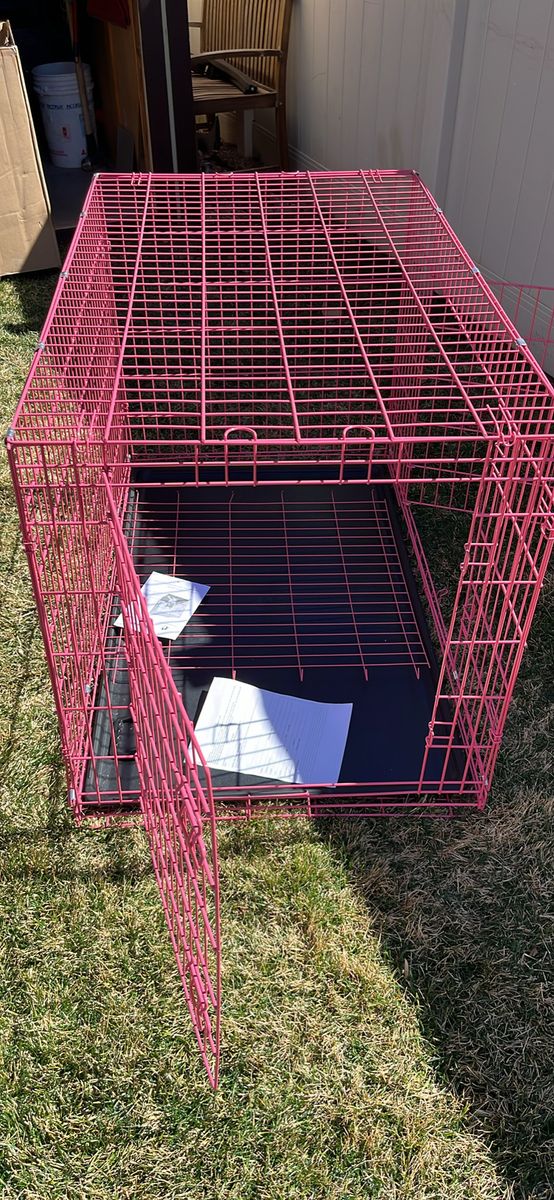 VenmoThis is a brand new 48 inch long by 32 inches tall by 29 inches wide, it is made for a large dog and is brand new with a wire divider so you could put two dogs in it, and double doors… hard to find a pink one!