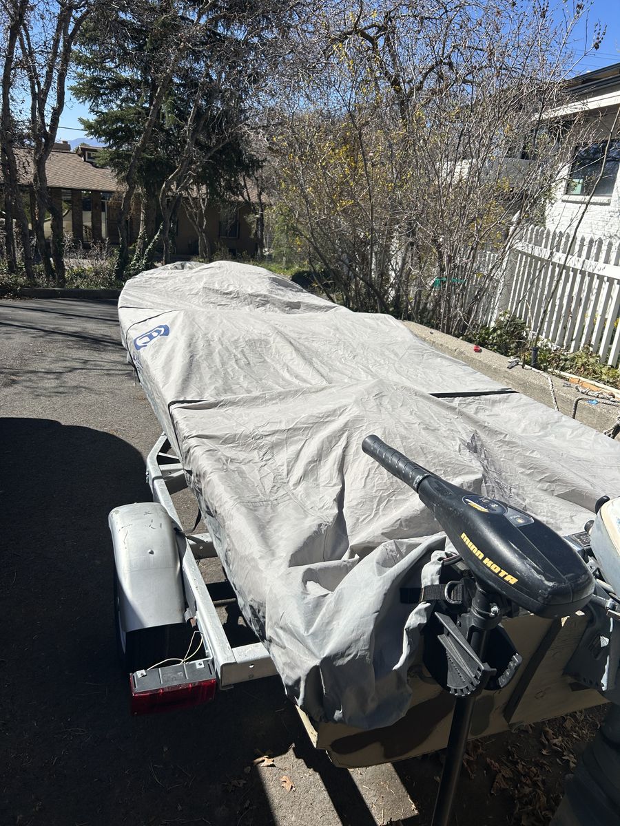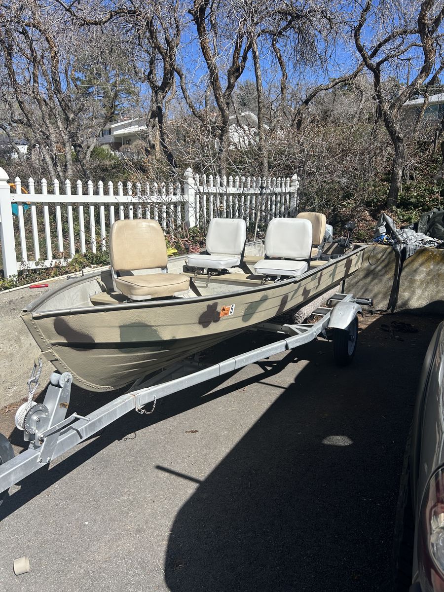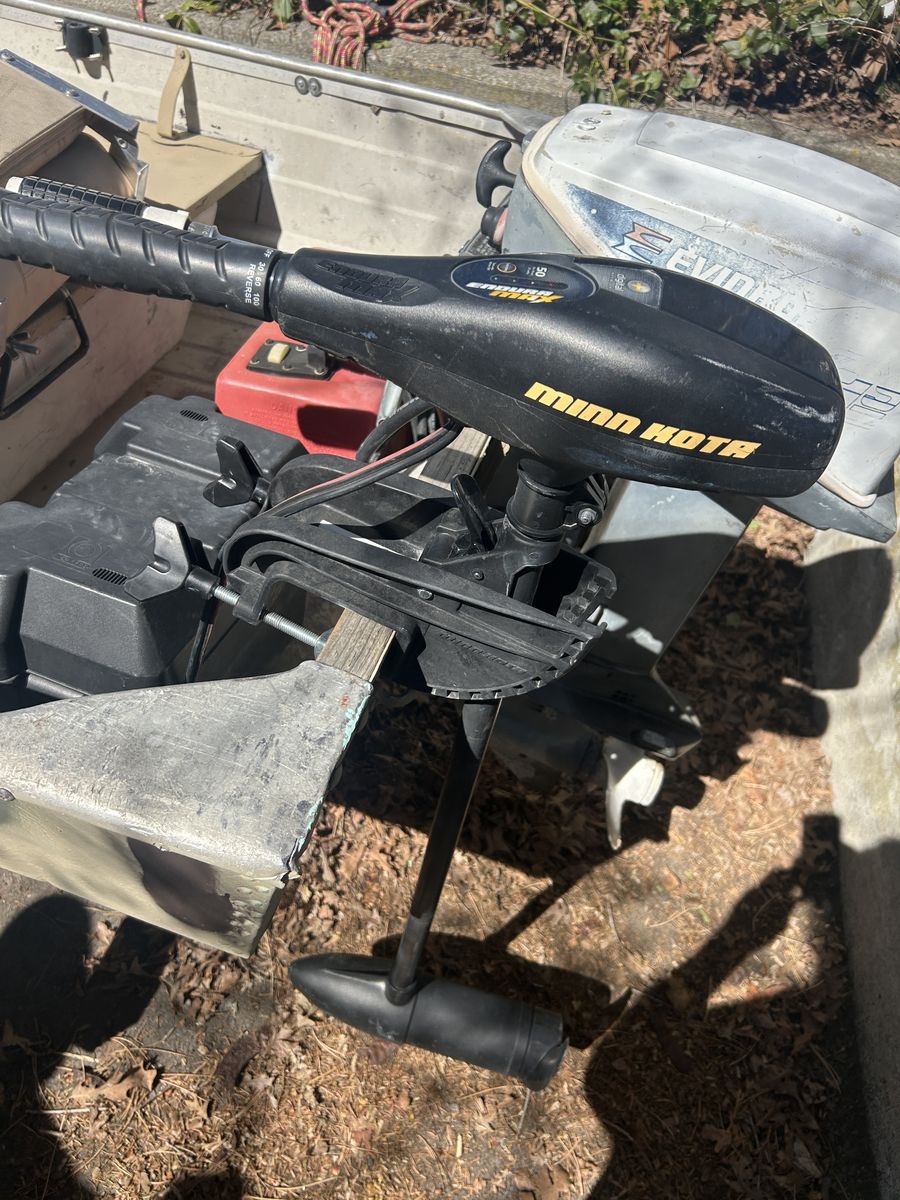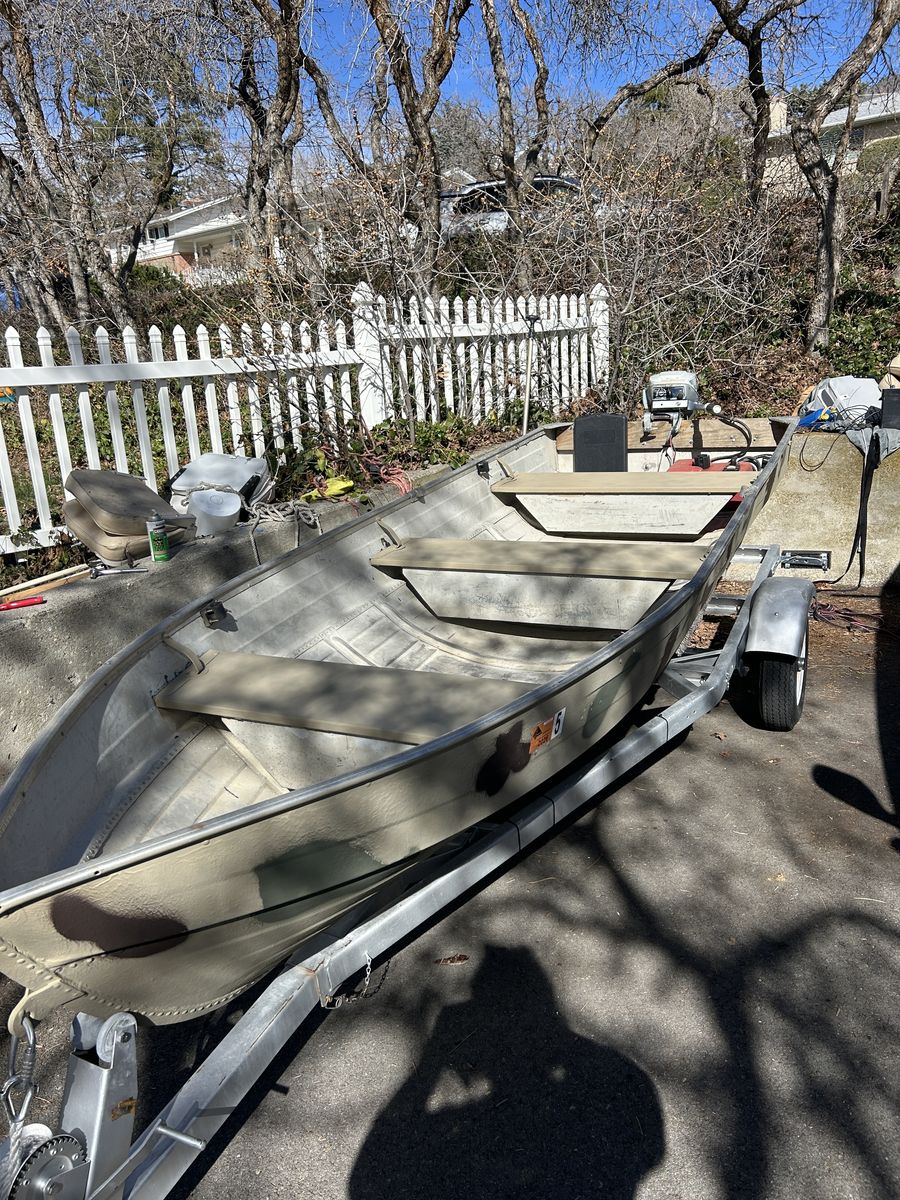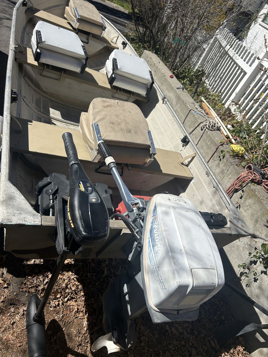 This is my 14 foot camo painted fishing and hunting boat. It has a 10 horsepower evinrude outboard motor as well as a Minn kota electric trolling motor. Both motors work great and have no issues. Boat has 4 seats that mount right on the benches that can easily be taken off if you don’t want them. Trailer lights and wiring work perfect and trailer is in great condition with a spare tire as well. It comes with a cover, anchor, paddles, fish finder, rod holders, and more! This boat is completely lake ready and could be taken out on the water today! $1300 Or best offer takes it!