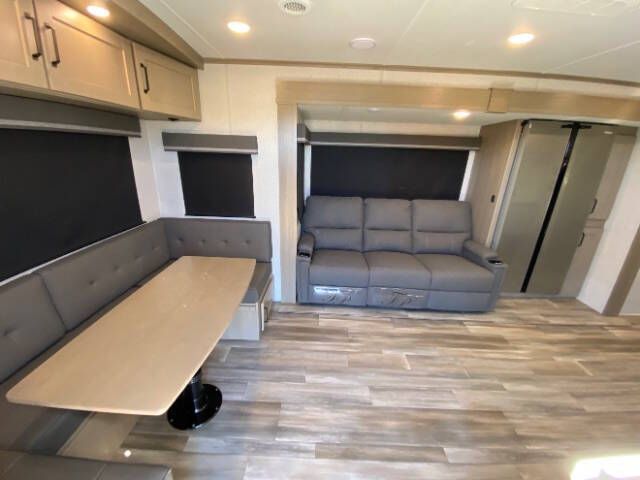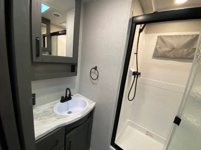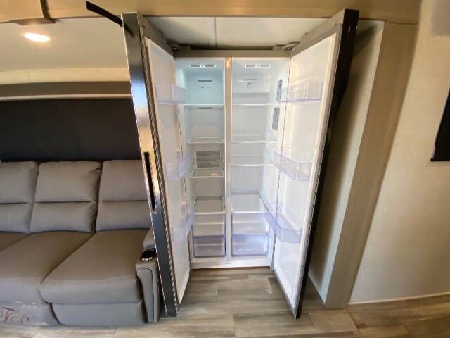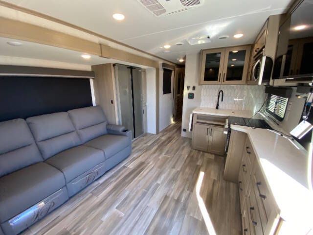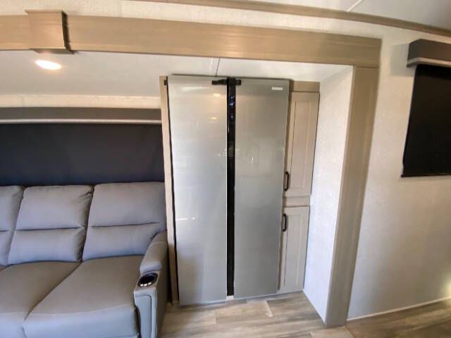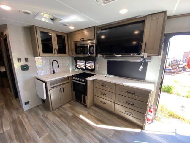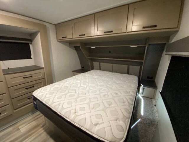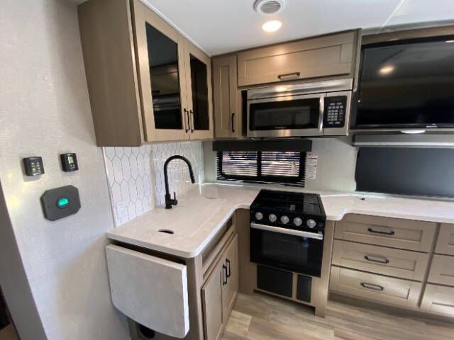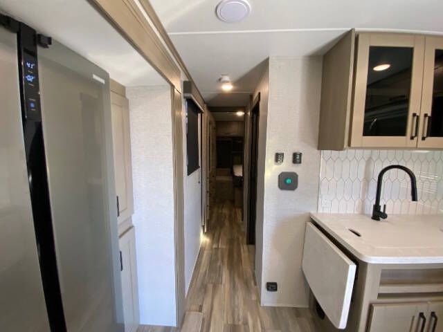 The Kitchen of Your Dreams: Forget "camper-sized" appliances. This unit features a massive 16 cu. ft. 12V refrigerator, solid surface countertops, and a deep-seated stainless steel sink.