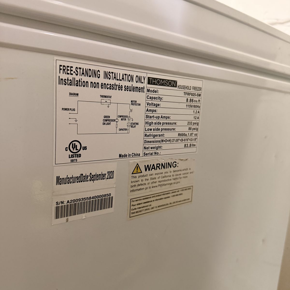 VenmoThomson chest freezer model TFRF925-SM 8.86 cu. ft garage deep freezer. USED. Freezer is a few years old and banged up cosmetically but works great. We just never use it.