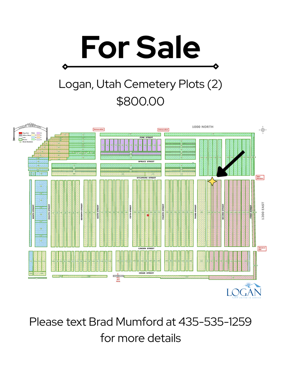 Two Cemetery Plots in the Logan Utah Cemetery available for sale, $800 each. Please text Brad Mumford at 435-535-1259 if interested.