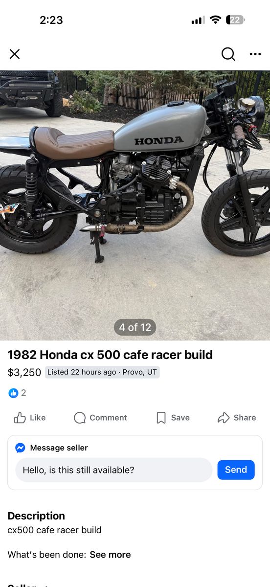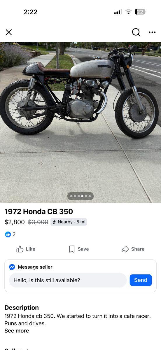 ZellePriced to sell compare to other ones. It starts right up no battery so kickstart. It has the original headlight tank and side covers etc. you can either restore it since it has a lot of the parts or turn it into a cafe racer however you like. Runs and drives great!