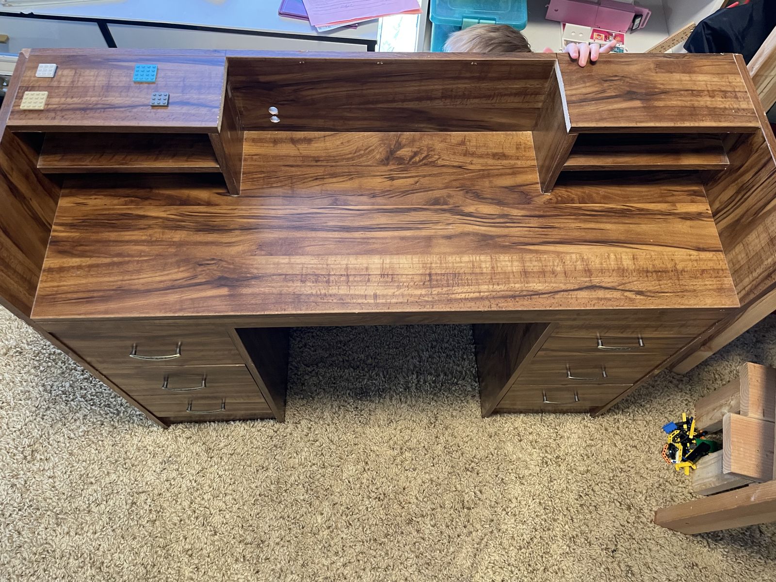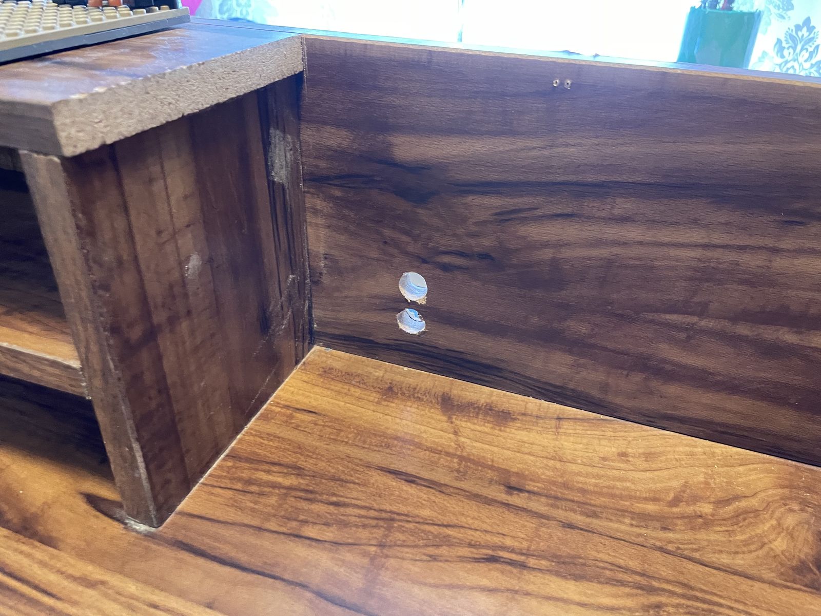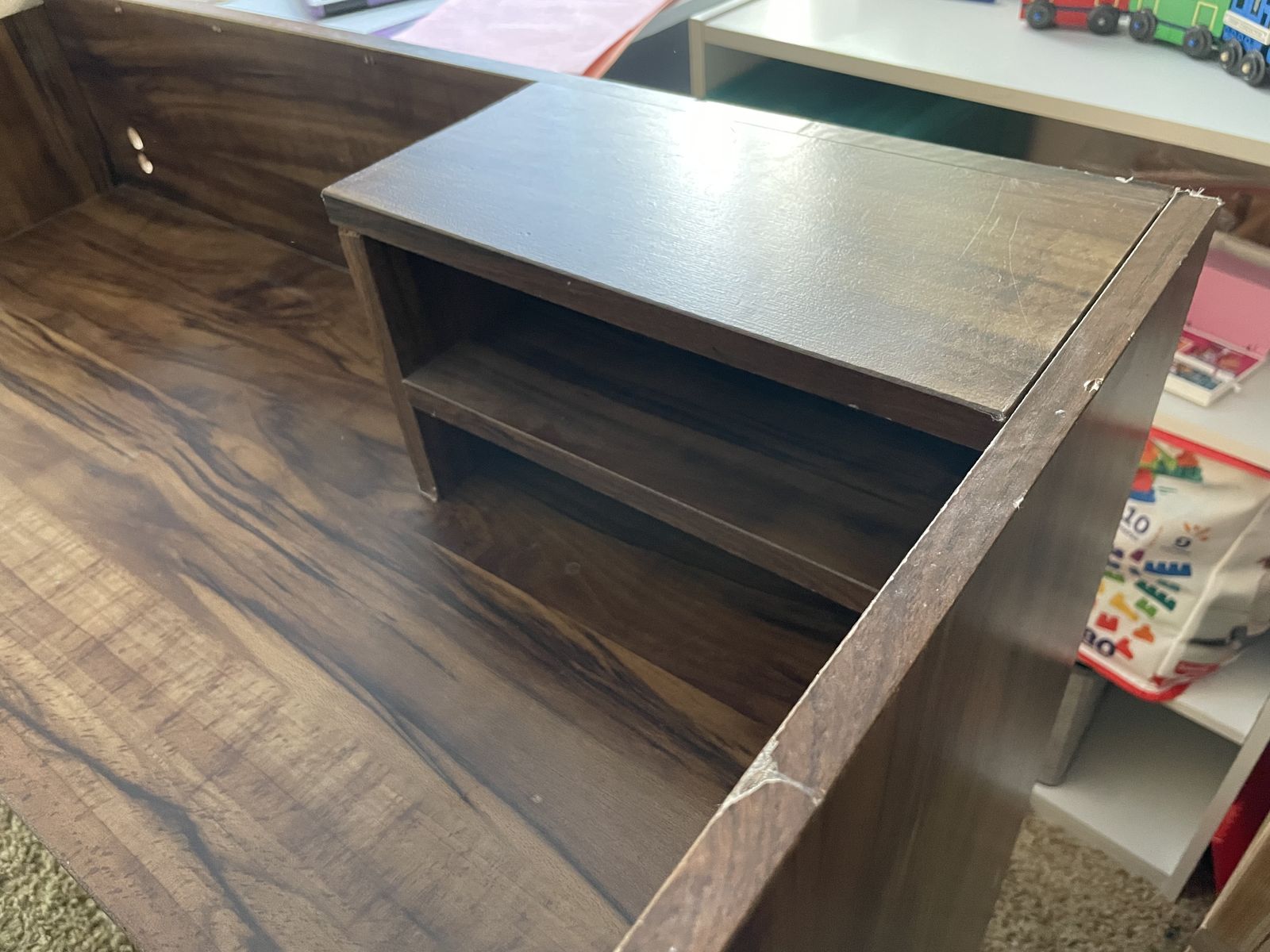 Imperfections here and there, but less than I’d expect for its age. We made it laptop friendly by removing the center part of the top shelf, and adding two cord holes at the back of the desktop.