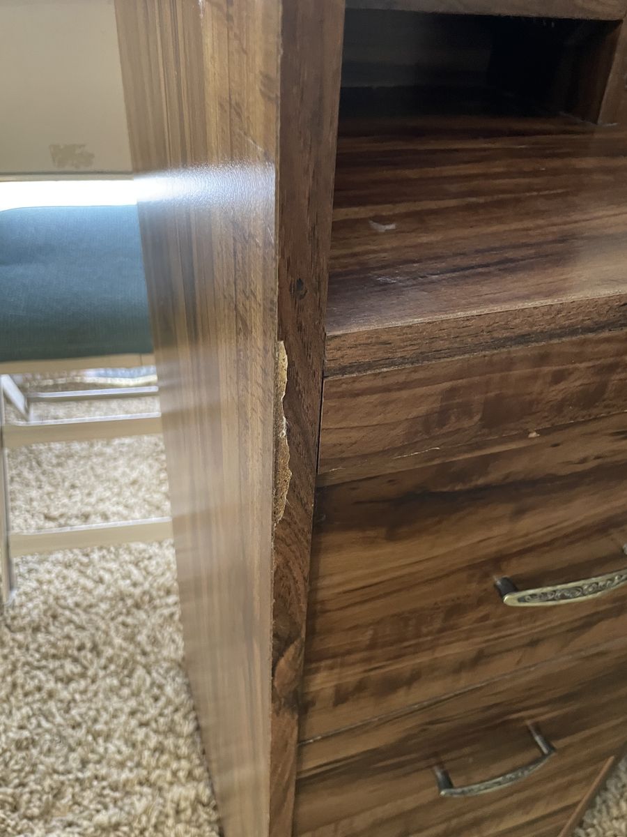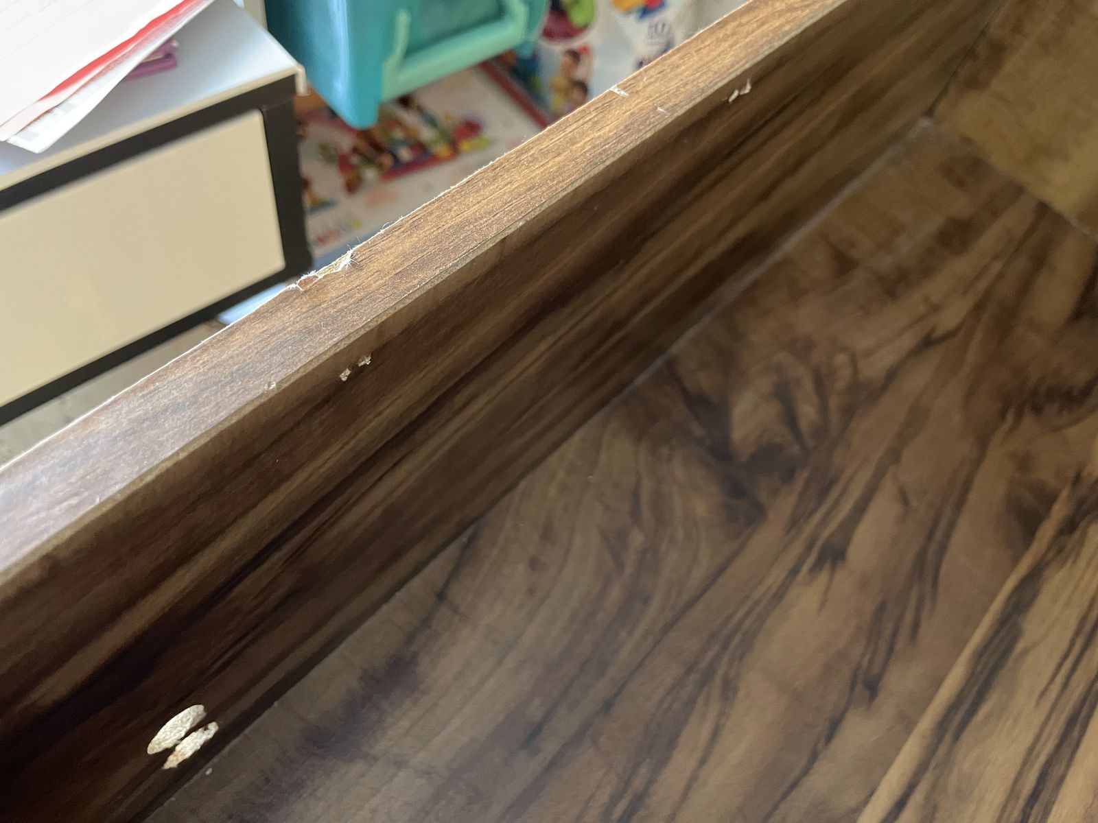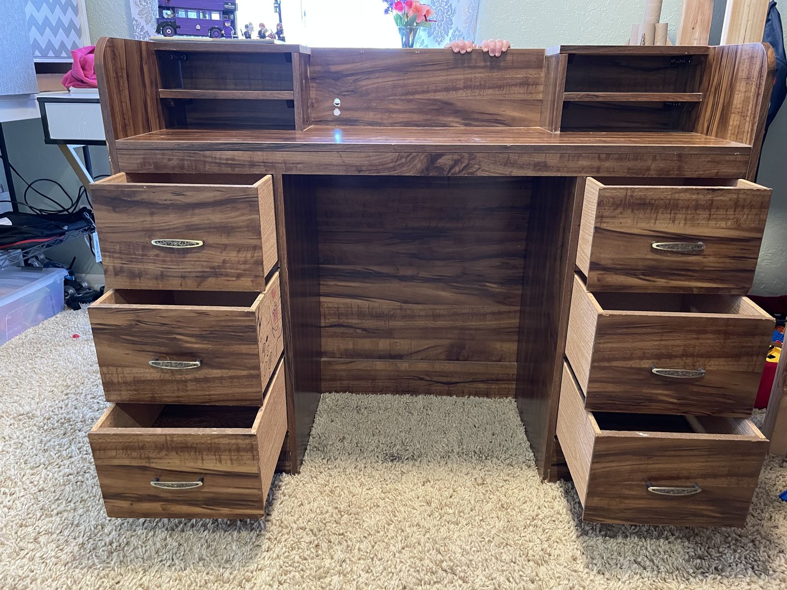 Imperfections here and there, but less than I’d expect for its age. We made it laptop friendly by removing the center part of the top shelf, and adding two cord holes at the back of the desktop.