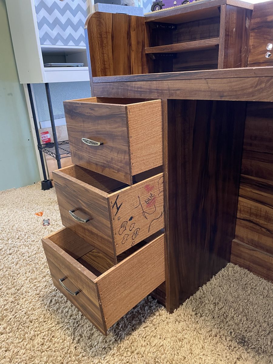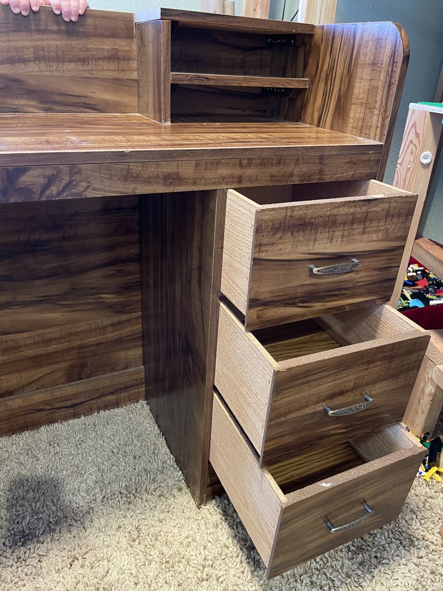 PayPalSmall, medium brown, wood laminate desk. I really like it but it is not practical for adult use so I’m replacing it.