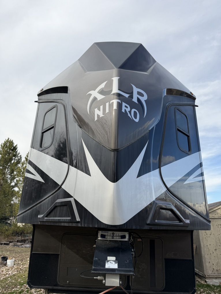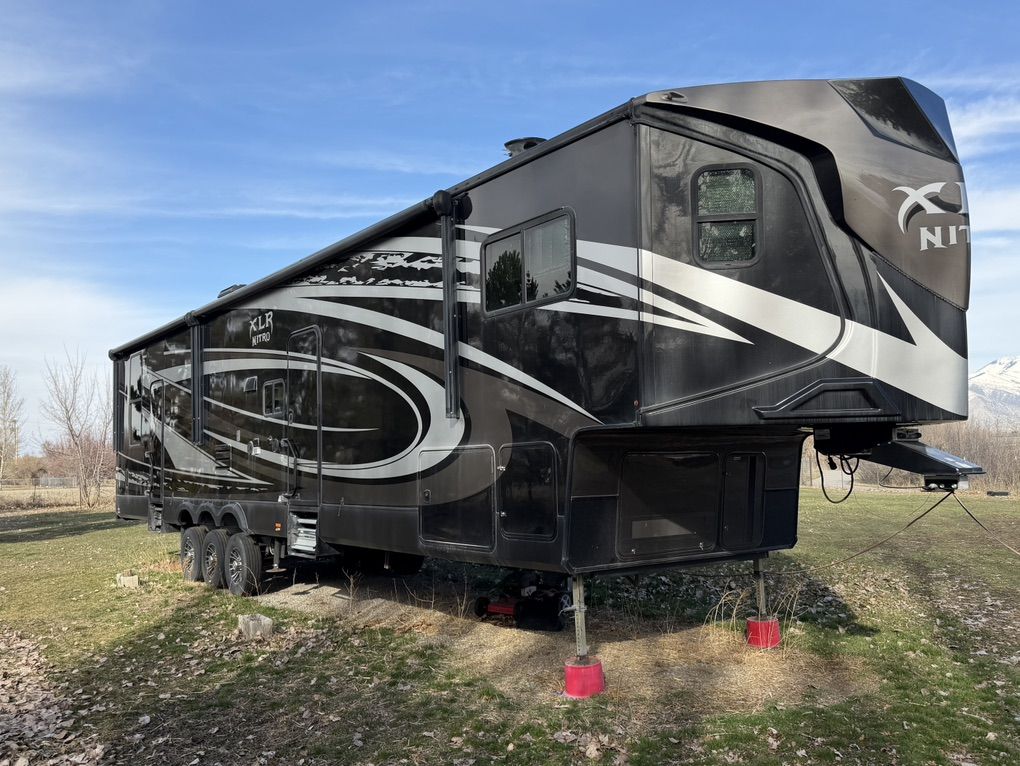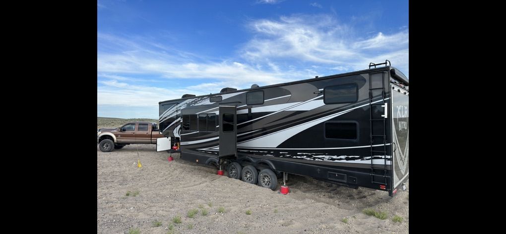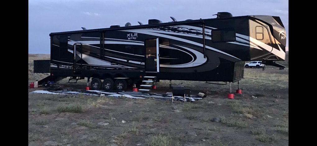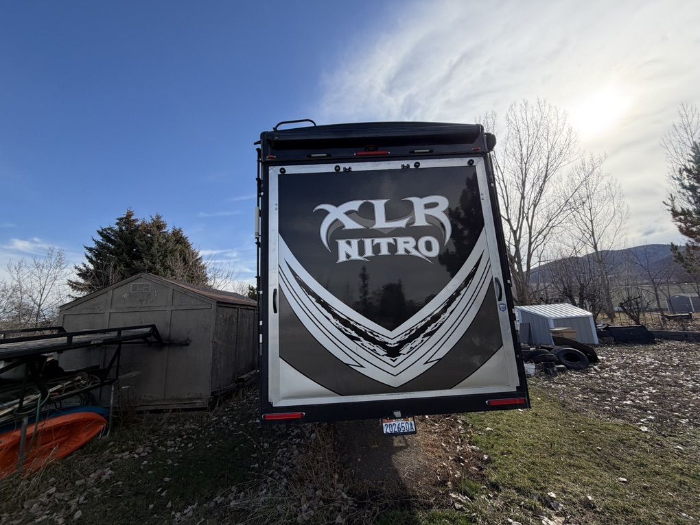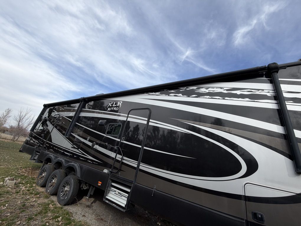 Factory Full body paint, This 2017 XLR Nitro Has Party Deck with gates and stairs, 16 foot garage, Sleeps 8 comfortably, all led lighting, New 14 ply Tires, New Lithium batteries, 5500 Cummins Onan generator, large solar panel with controller, self adjusting automatic satellite, 4000W inverter, duel 15000 HVAC units , 35,000 btu forced air furnace, electric and gas water heater, 3 rain sensing auto vents, heated tanks, 2 powered slides, 3 powered awnings, fuel station, heated and vibrating recliner seating 16’ separate garage, 3 indoor tv’s and 1 outdoor TV mount , large fridge, Microwave, 3 burner stove with oven, lots of storage, washer dryer hook ups, powered bunks in the back and the lower one turns into seating area Great for lifted trucks! has a 6” lift from the factory, has 6 point auto leveling $56,500 OBO has been dubbed the name Godzilla
