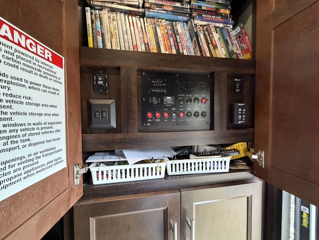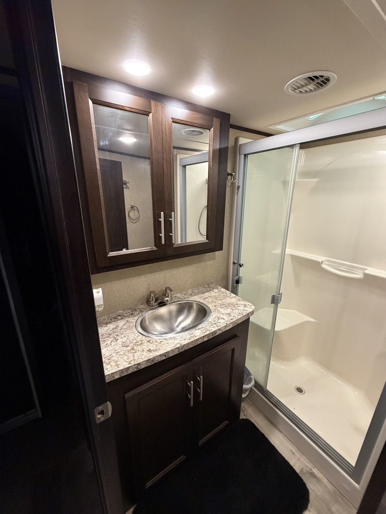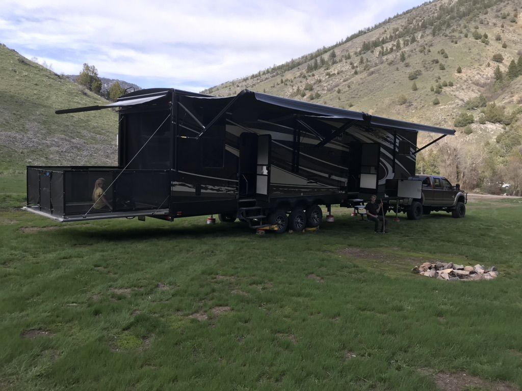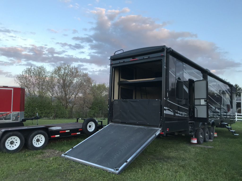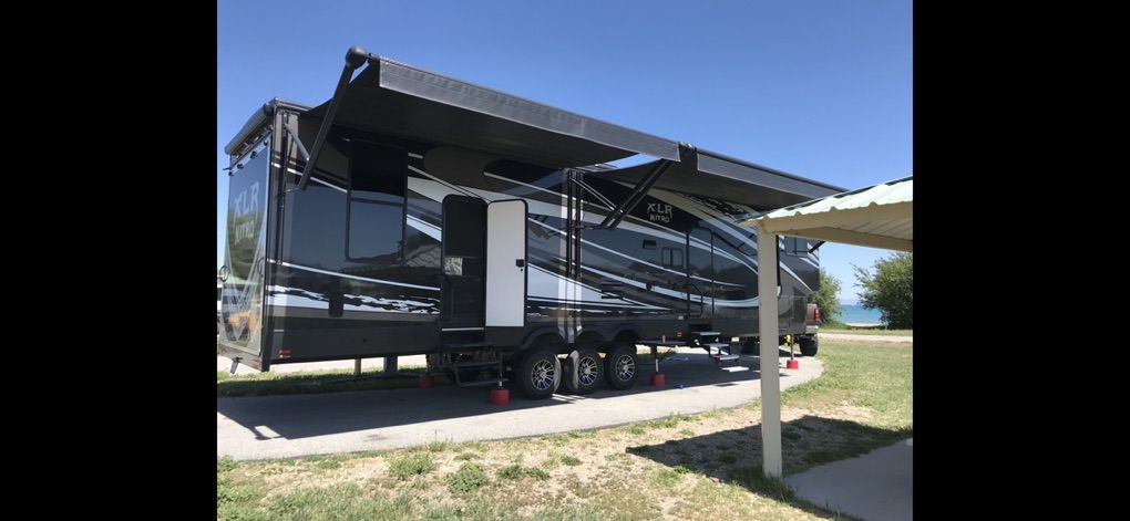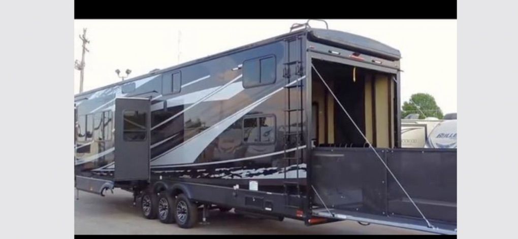 Factory Full body paint, This 2017 XLR Nitro Has Party Deck with gates and stairs, 16 foot garage, Sleeps 8 comfortably, all led lighting, New 14 ply Tires, New Lithium batteries, 5500 Cummins Onan generator, large solar panel with controller, self adjusting automatic satellite, 4000W inverter, duel 15000 HVAC units , 35,000 btu forced air furnace, electric and gas water heater, 3 rain sensing auto vents, heated tanks, 2 powered slides, 3 powered awnings, fuel station, heated and vibrating recliner seating 16’ separate garage, 3 indoor tv’s and 1 outdoor TV mount , large fridge, Microwave, 3 burner stove with oven, lots of storage, washer dryer hook ups, powered bunks in the back and the lower one turns into seating area Great for lifted trucks! has a 6” lift from the factory, has 6 point auto leveling $56,500 OBO has been dubbed the name Godzilla