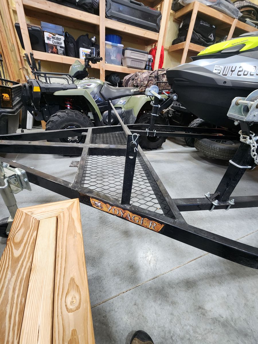 New 2 place Voyager trailer with locking gas can platform and spare tire.