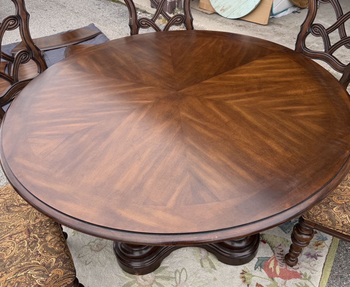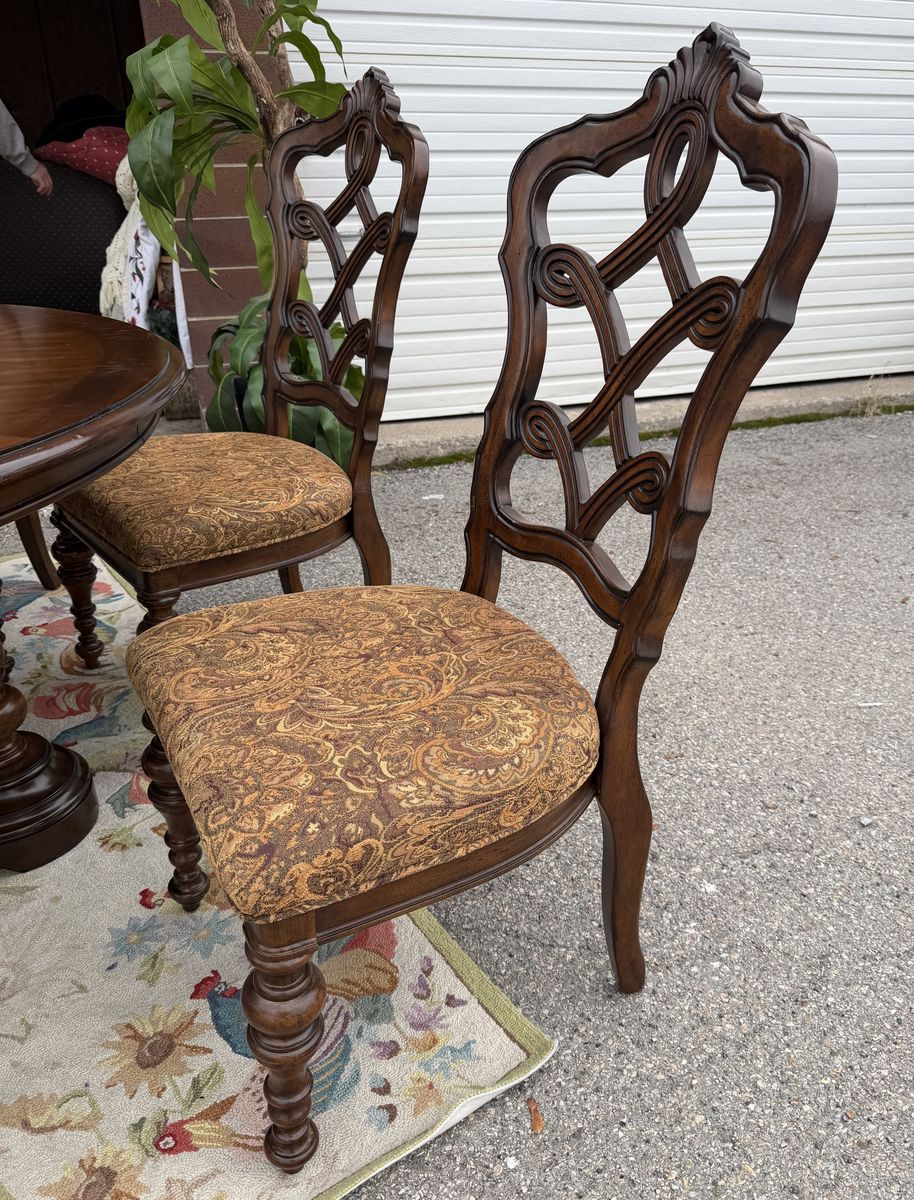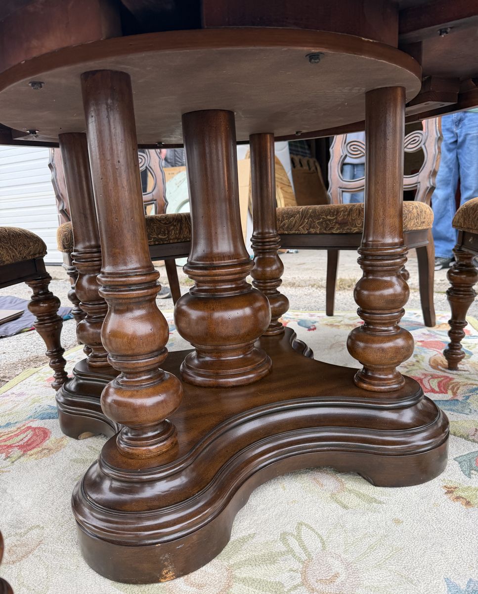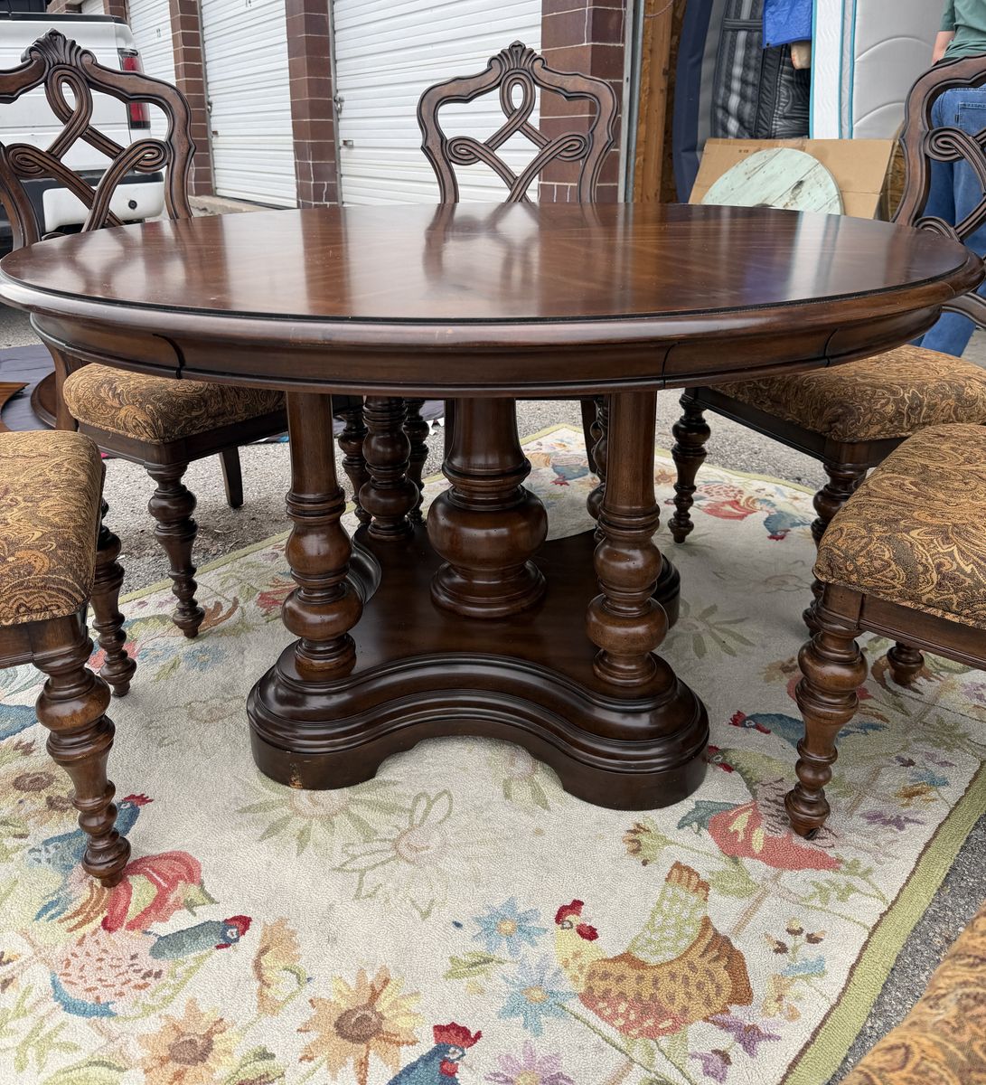 VenmoPristine - high quality perimeter leaf round dining table made of solid wood in dark Mahoney color , 6 - matching padded chairs as shown. 54” round without leaf - about 84” with 6 leaf’s added. Plenty of room for these large padded decorative wooded chairs. Beautiful piece- we just don’t have a space to use it. Comes from a smoke and pet free home. Located in Cache County