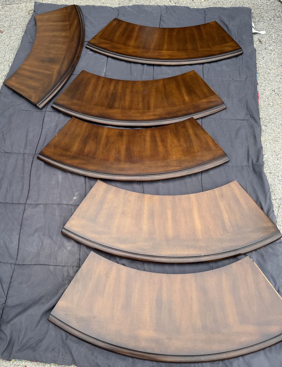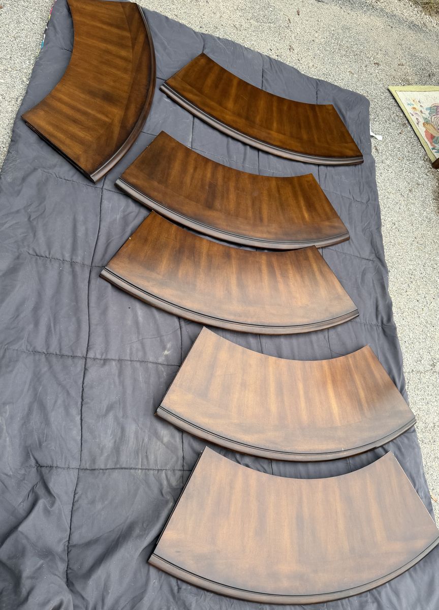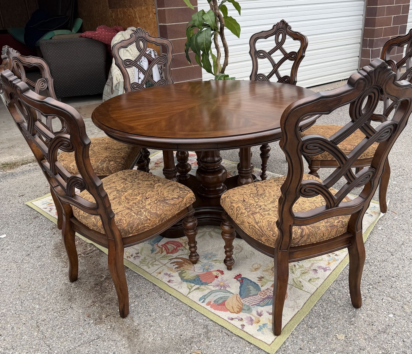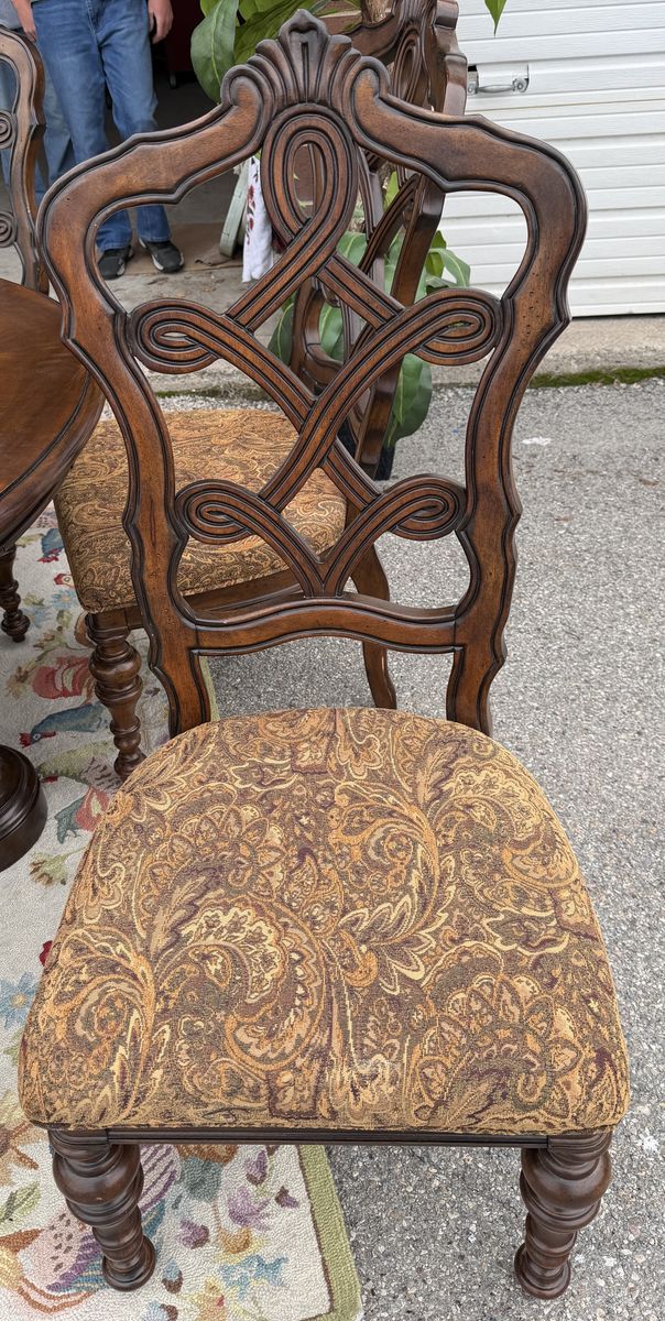 VenmoPristine - high quality perimeter leaf round dining table made of solid wood in dark Mahoney color , 6 - matching padded chairs as shown. 54” round without leaf - about 84” with 6 leaf’s added. Plenty of room for these large padded decorative wooded chairs. Beautiful piece- we just don’t have a space to use it. Comes from a smoke and pet free home. Located in Cache County