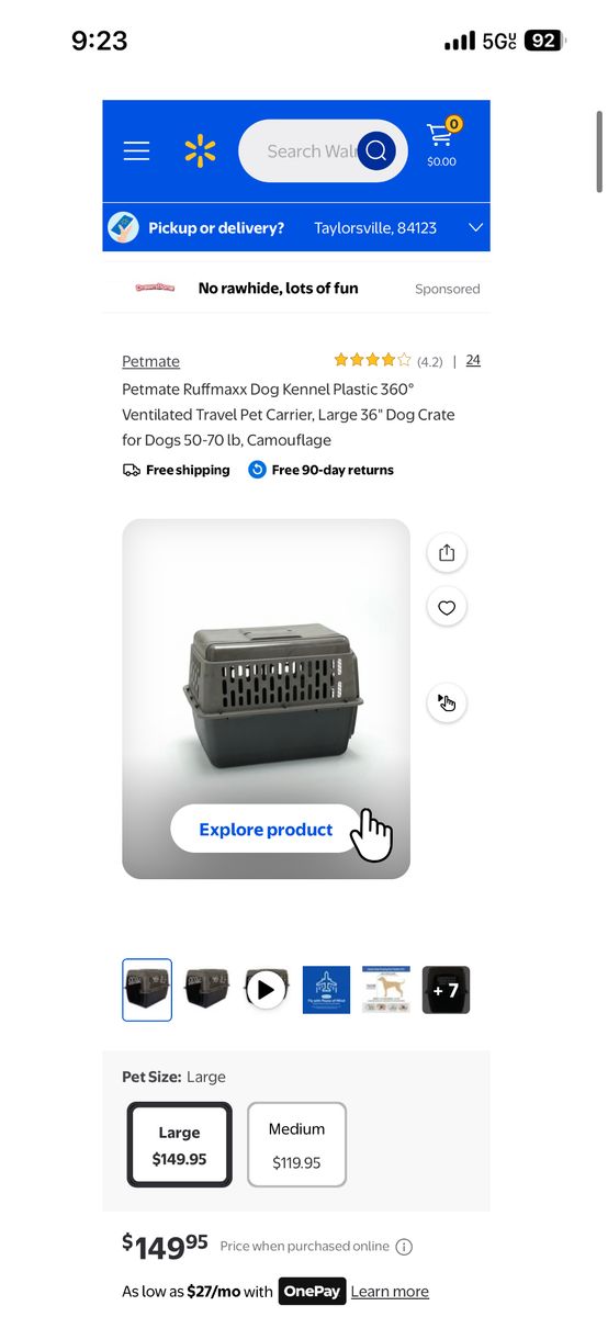 VenmoThis is a brand new 36 inch long by 25 inches wide 27 inches high … camouflage dog crate and is for 50 to 70 pound dog …. this sells for $149 retail