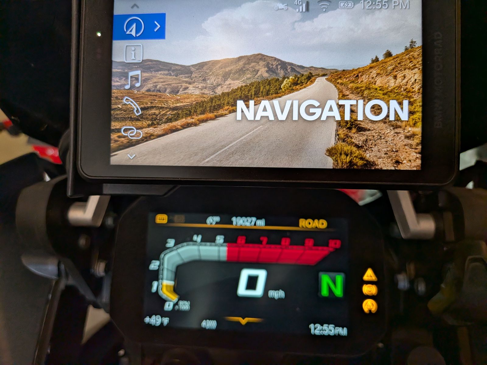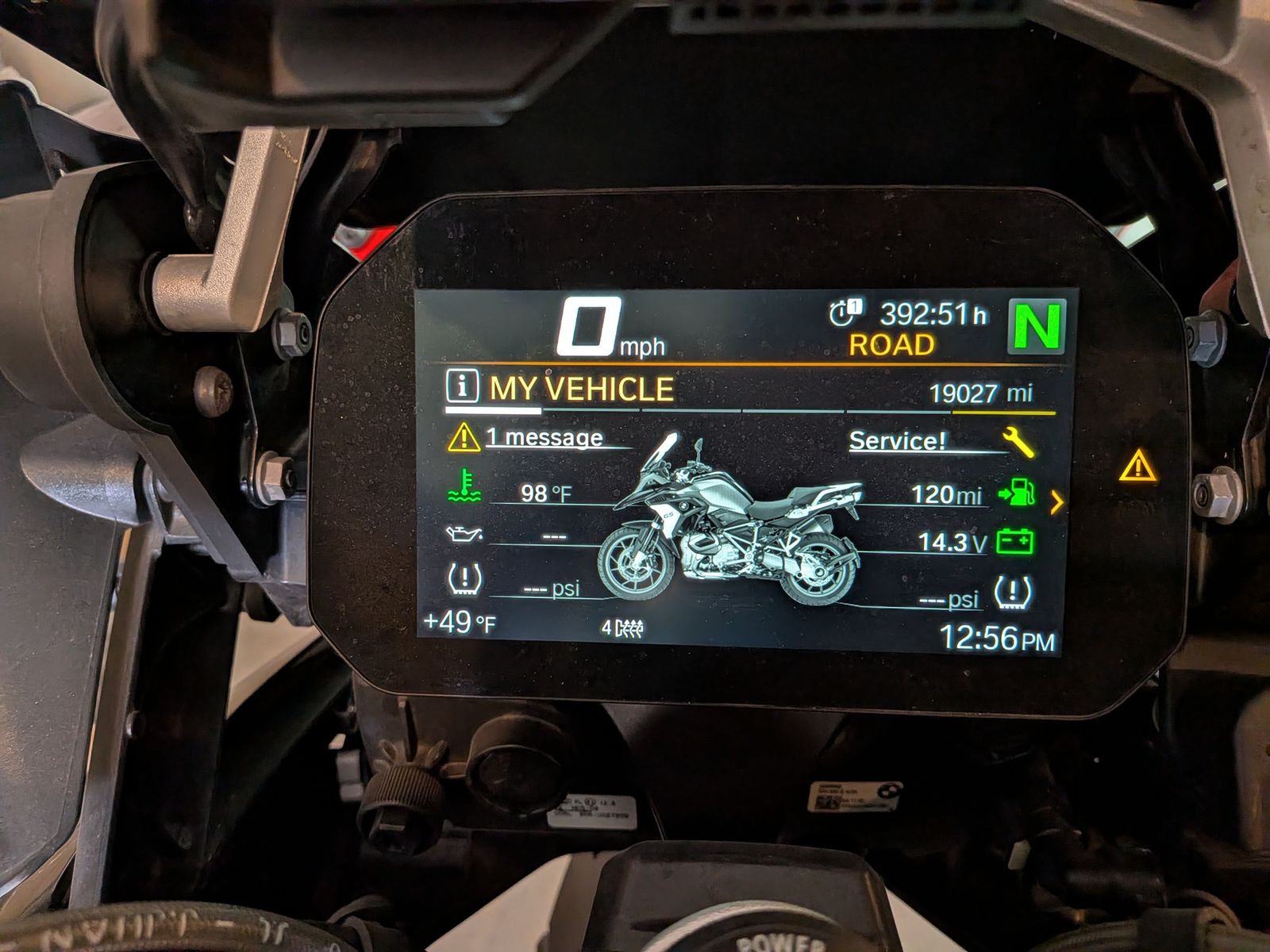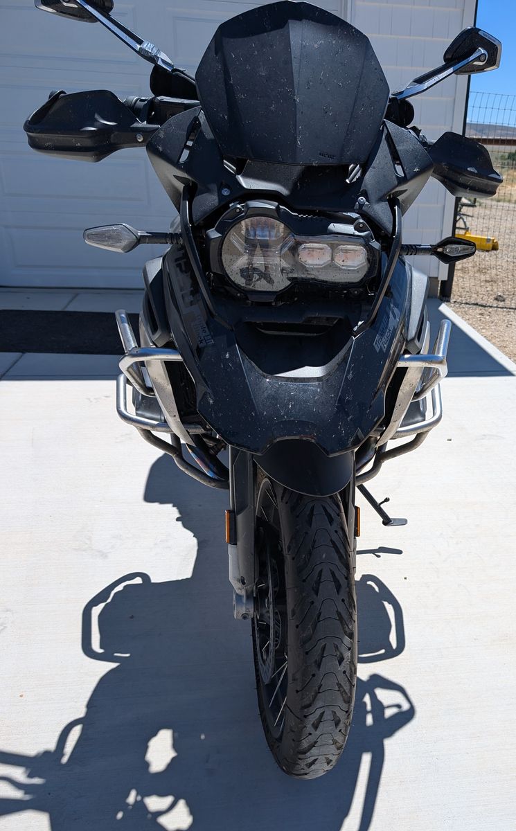 This BMW R1250GS has a lowered suspension, including a Touratech X-Tra low seat, which lets me flat-foot this adventure bike. The bike also has a lowered V Windscreen that splits the wind, while eliminating buffeting.