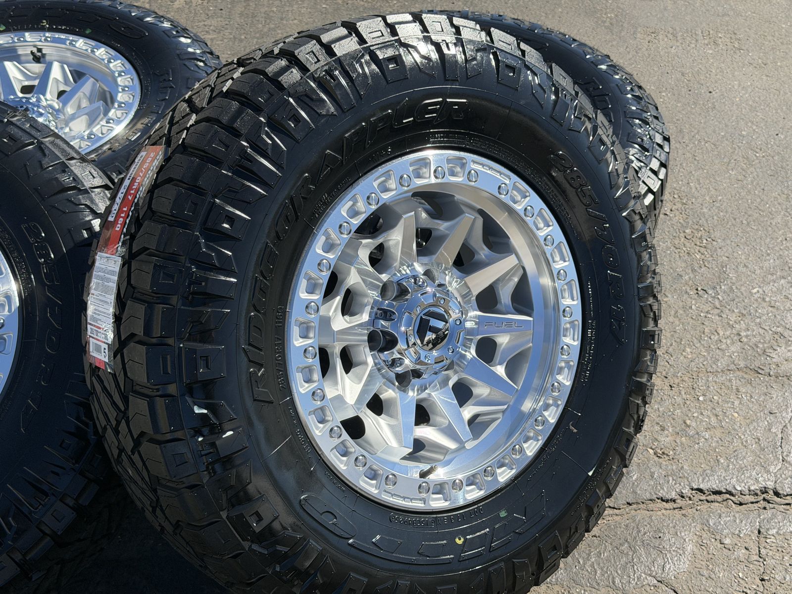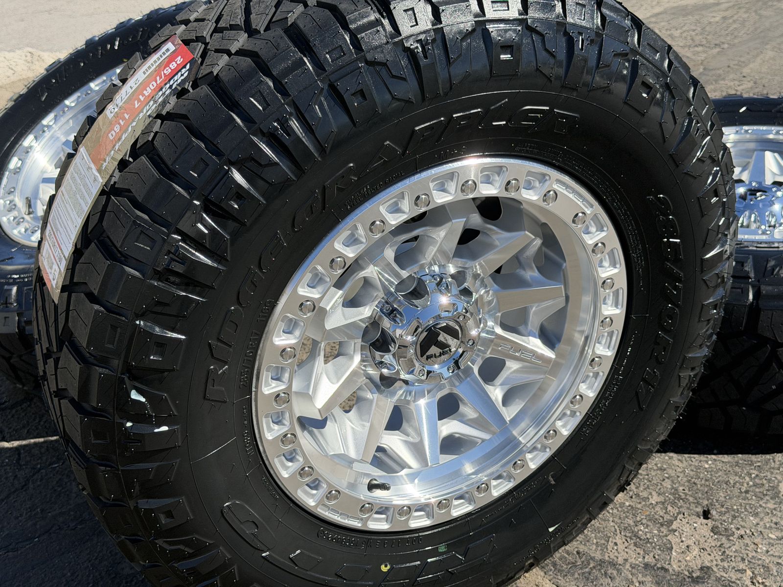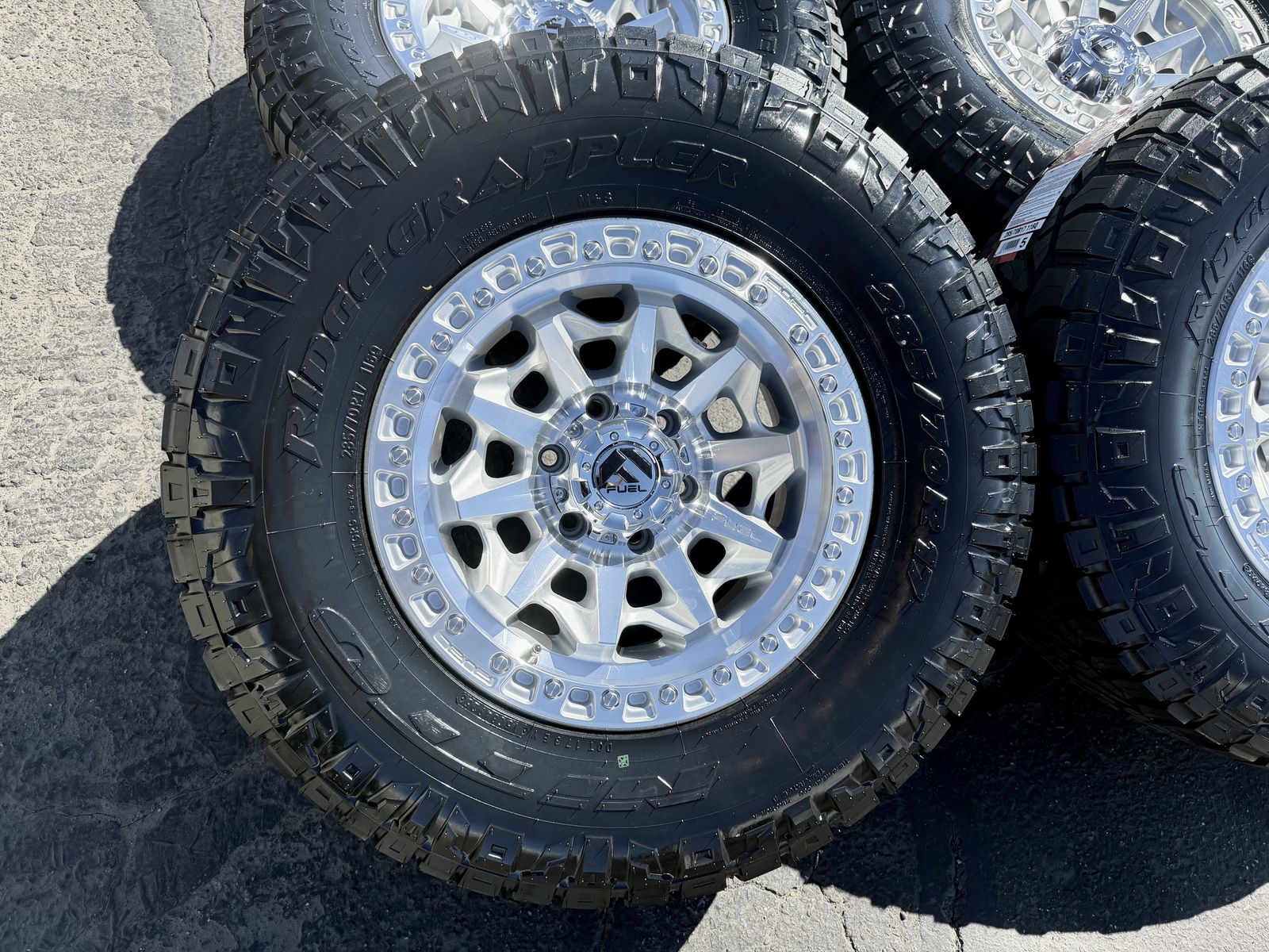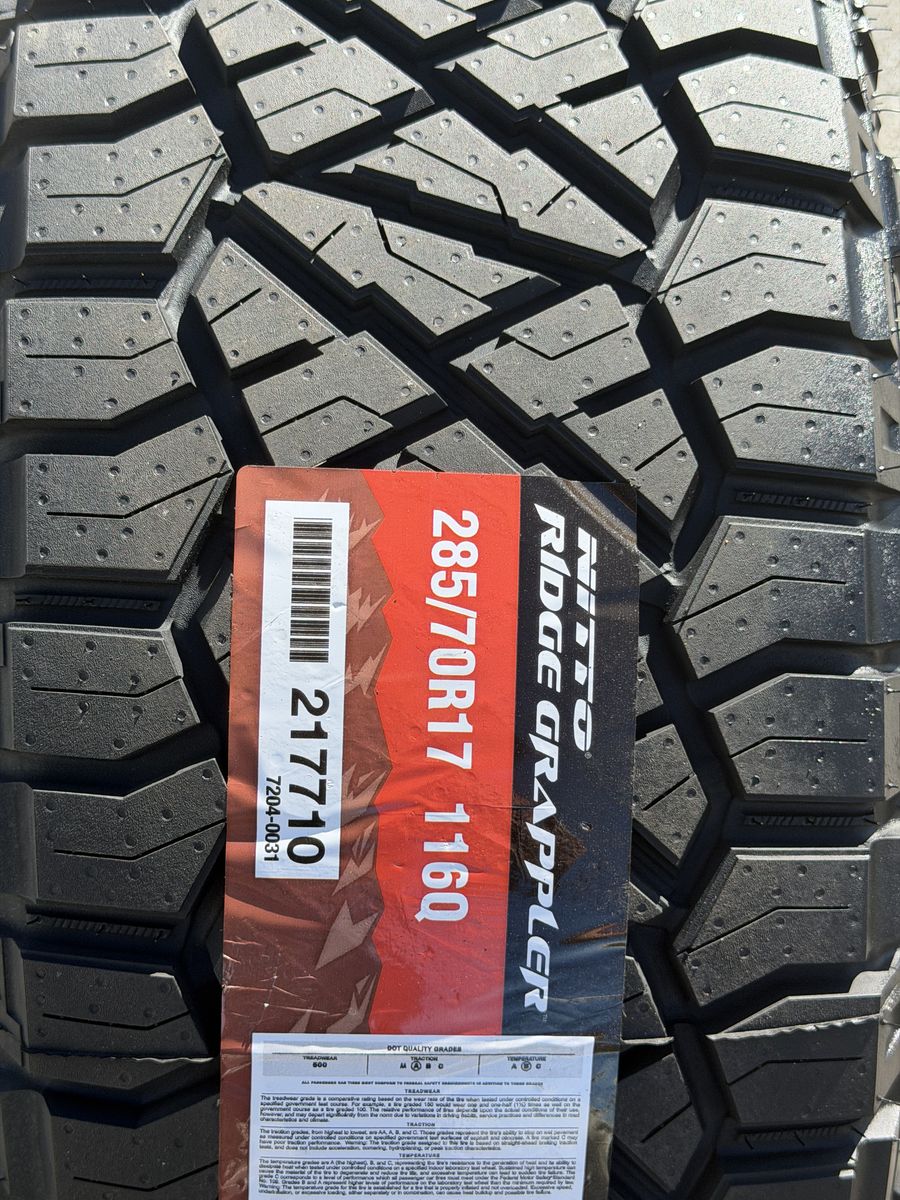 285/70r17 Nitto Ridge Grappler’s mounted and balanced on new Silver Fuel Covert wheels. 17x8.5 00et offset. 6x5.5 bolt pattern (6x139.7). These fit Chevrolet Silverado 1500 GMC Sierra yukon tahoe Nissan Titan Ford Ranger and Toyota Tacoma’s