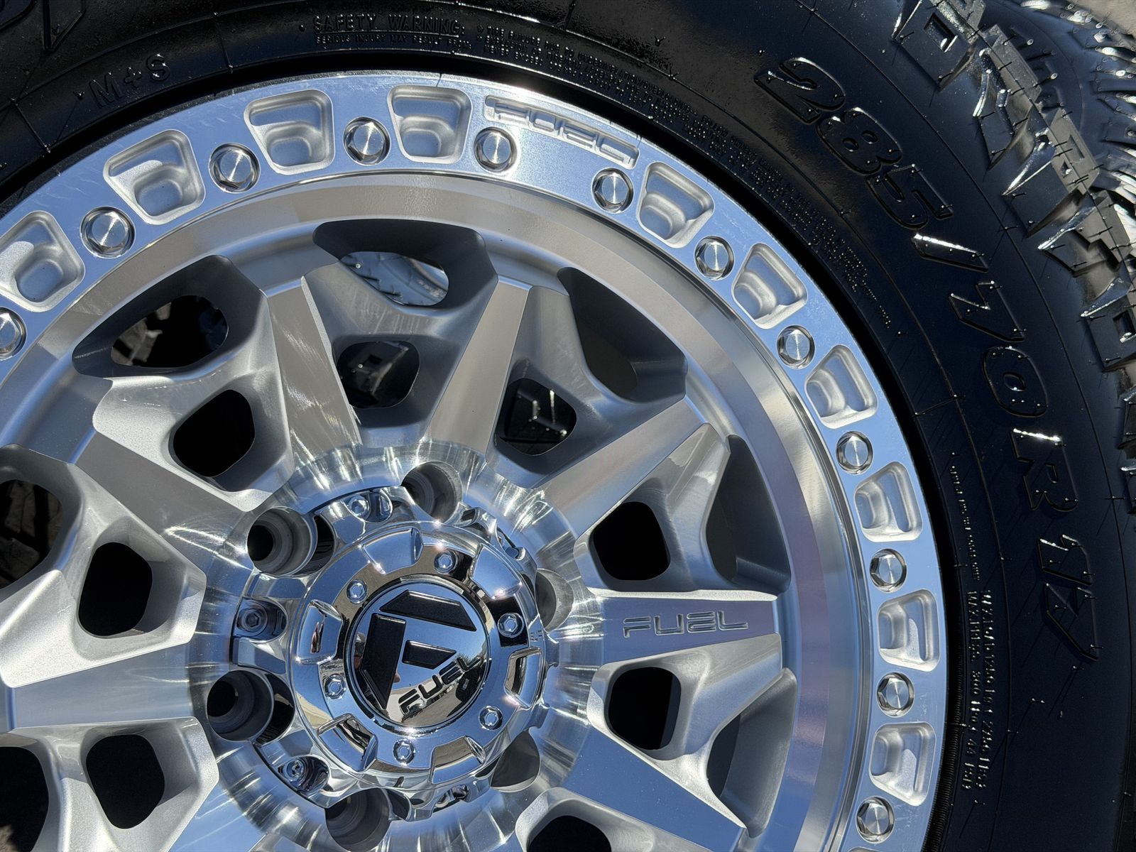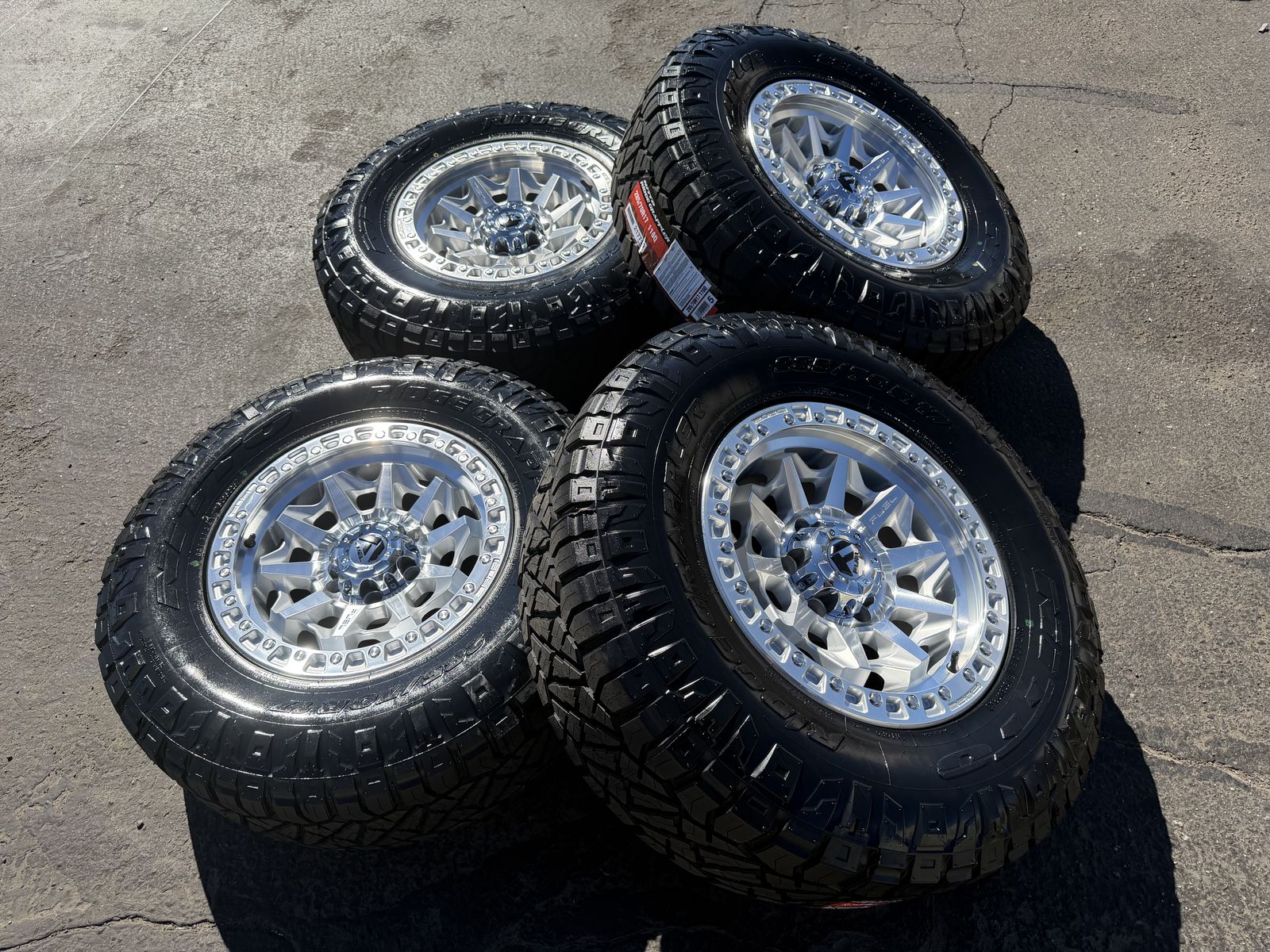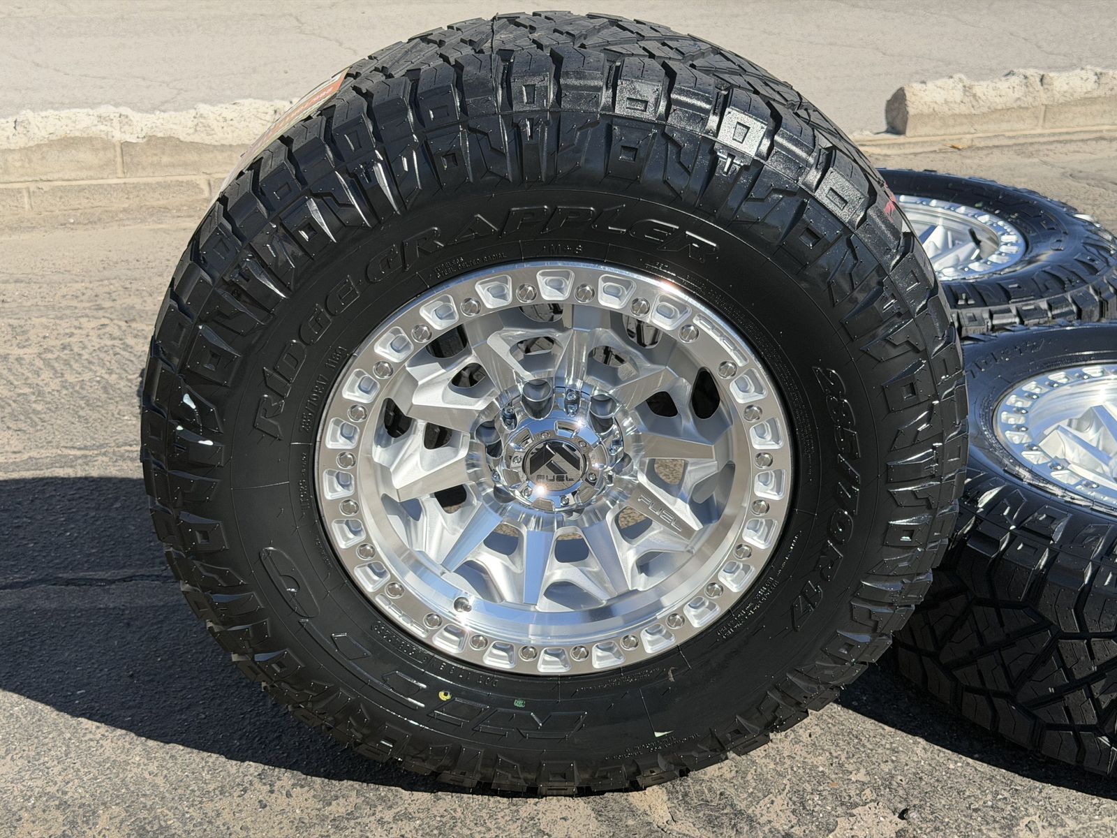 285/70r17 Nitto Ridge Grappler’s mounted and balanced on new Silver Fuel Covert wheels. 17x8.5 00et offset. 6x5.5 bolt pattern (6x139.7). These fit Chevrolet Silverado 1500 GMC Sierra yukon tahoe Nissan Titan Ford Ranger and Toyota Tacoma’s
