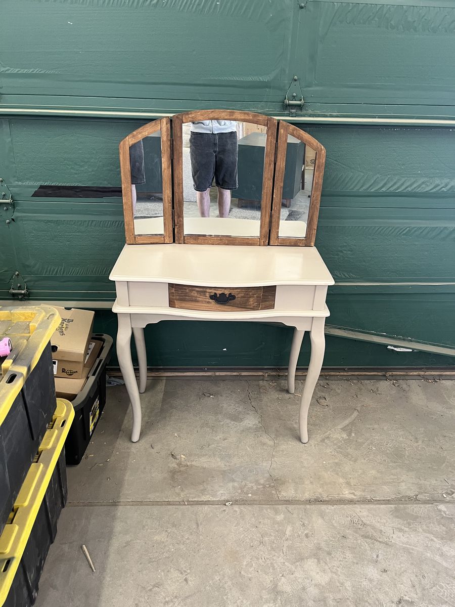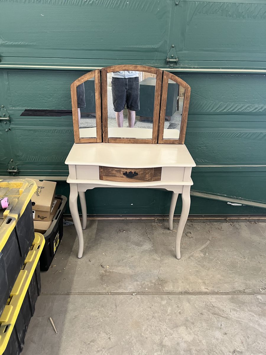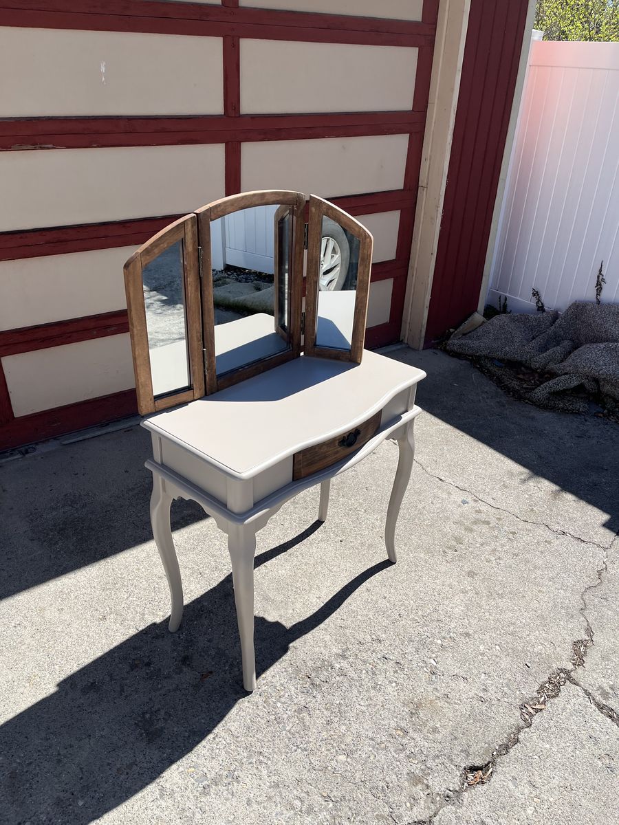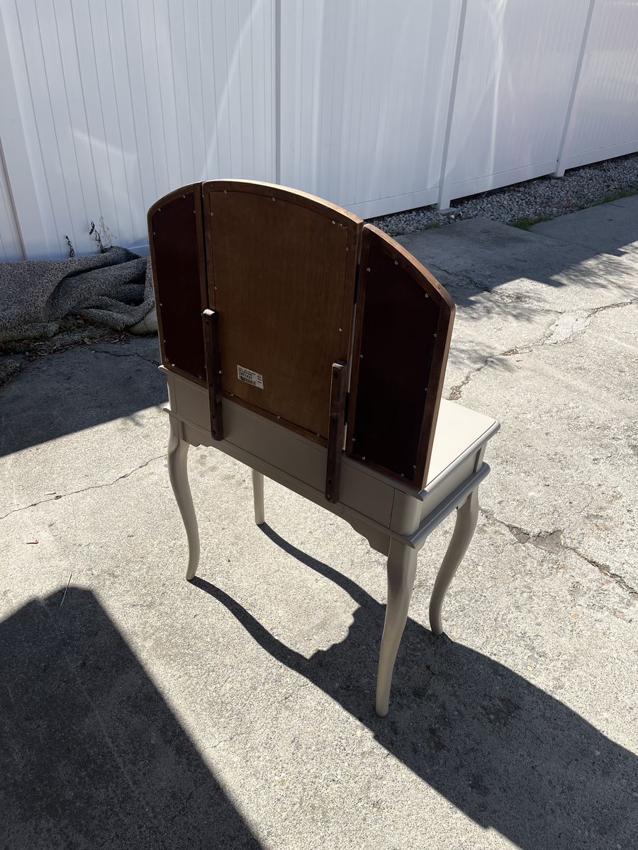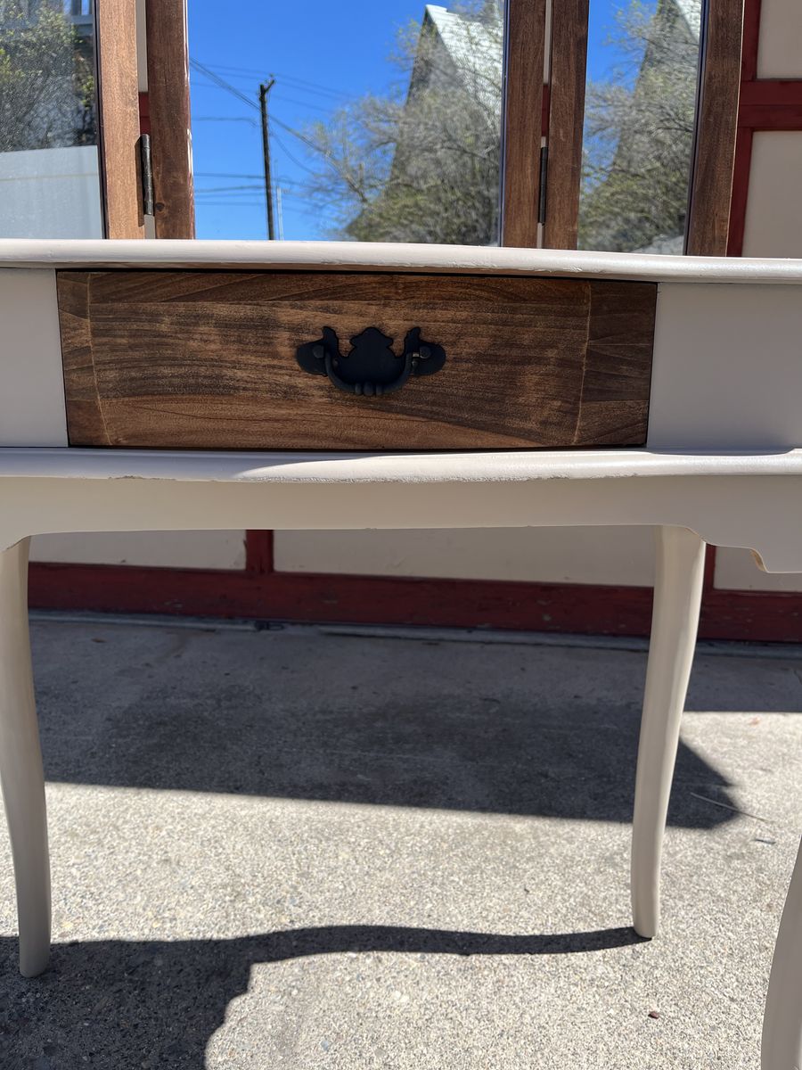 Beautifully refinished French Provincial makeup vanity with attached tri-fold mirror — ready to be the focal point of your bedroom or dressing room. Features a stunning two-tone finish: soft French beige painted base with warm walnut-stained wood accents on the mirror frame and center drawer front. Elegant cabriole legs, black vintage hardware, and a clean smooth finish throughout. Solid and sturdy construction. Fits farmhouse, cottage, French country, or transitional styles perfectly. Measurements: • Desk: 31”W × 14.5”D × 30”H • Total height with mirror: 50.5” Free local delivery included Mirror folds for easy transport Move-in ready — no work needed $200 — price is firm. Serious inquiries only.
