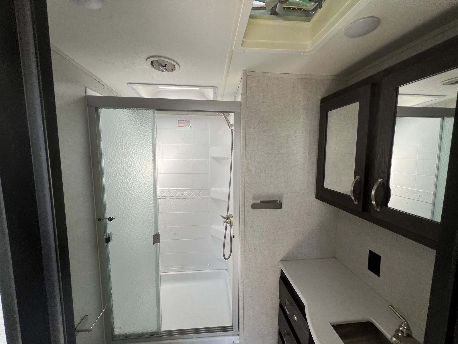 Inside, you'll find a spacious living area with comfortable seating, large panoramic windows, and modern finishes that make it feel like home on the road. The fully equipped kitchen features solid-surface countertops, stainless appliances, ample storage, and a large refrigerator—perfect for cooking at the campsite.