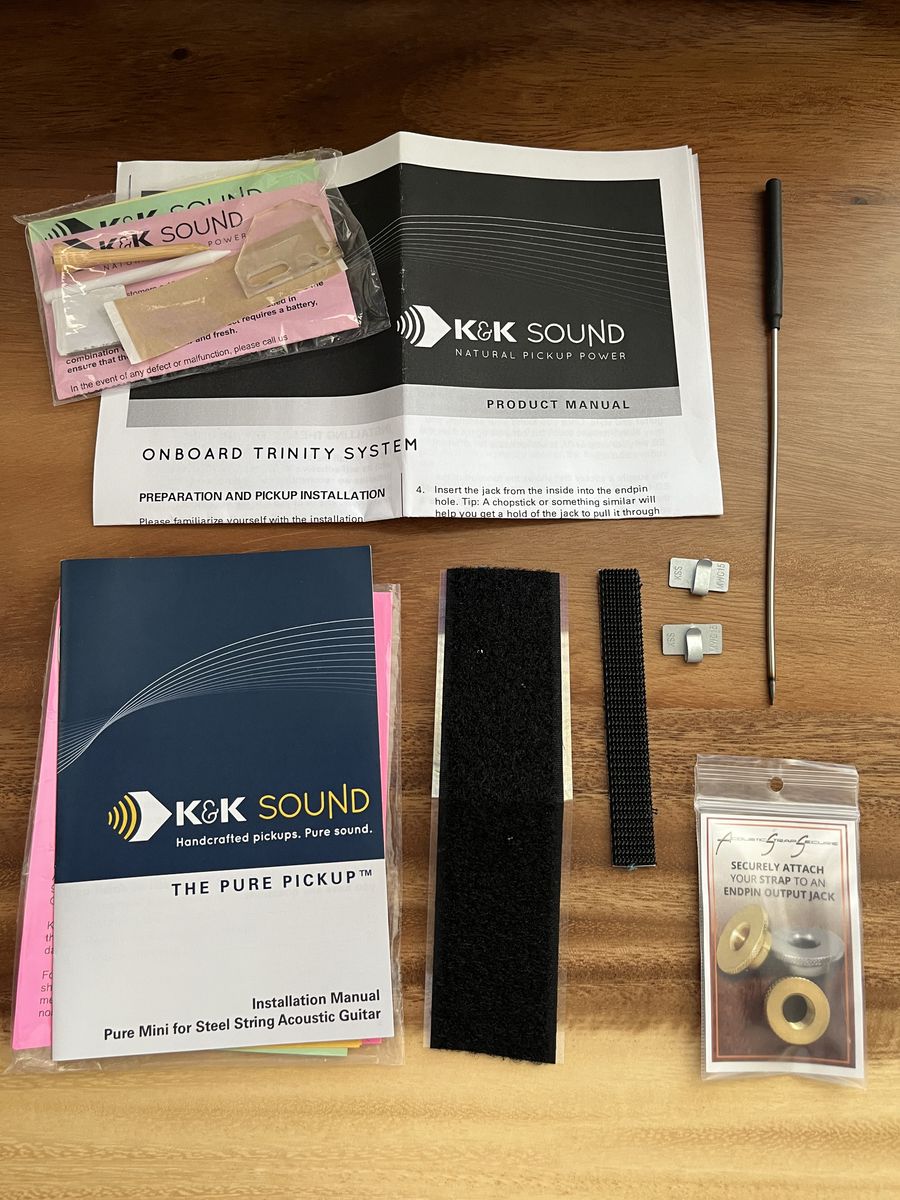 Comes with everything pictured: the pickup system, manuals, tool for turning the EQ knobs when it's in the guitar, some velcro/dual-lock, and an extra endpin strap lock from Acoustic Strap Secure.