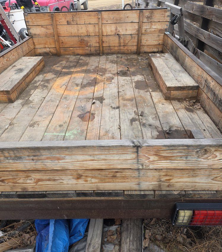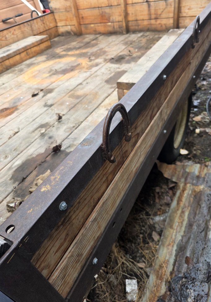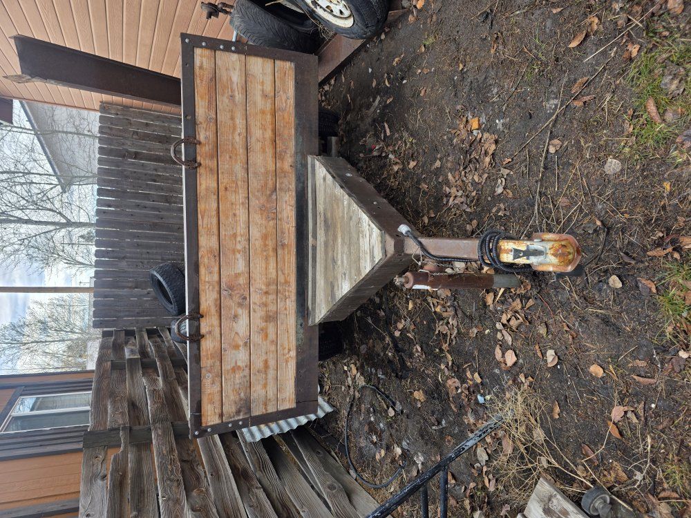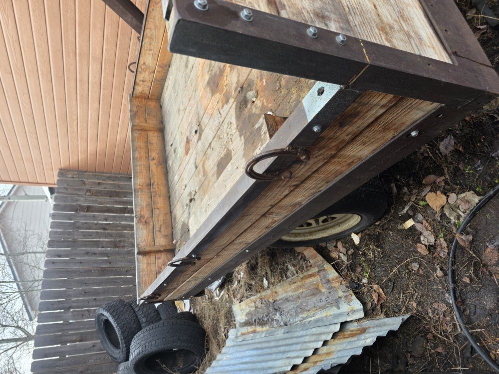 PayPal89.5 long 73 wide 149 1/4 overall length handmade trailer, wood was redone in 2022 and it 2x6 2x4 flooring and side walls. In really great shape but need re sanded and sealed. It is muddy from our recent dirt and leaf haul. Led tail lights, welded tie downs, located in fairfield comes with spare tire.