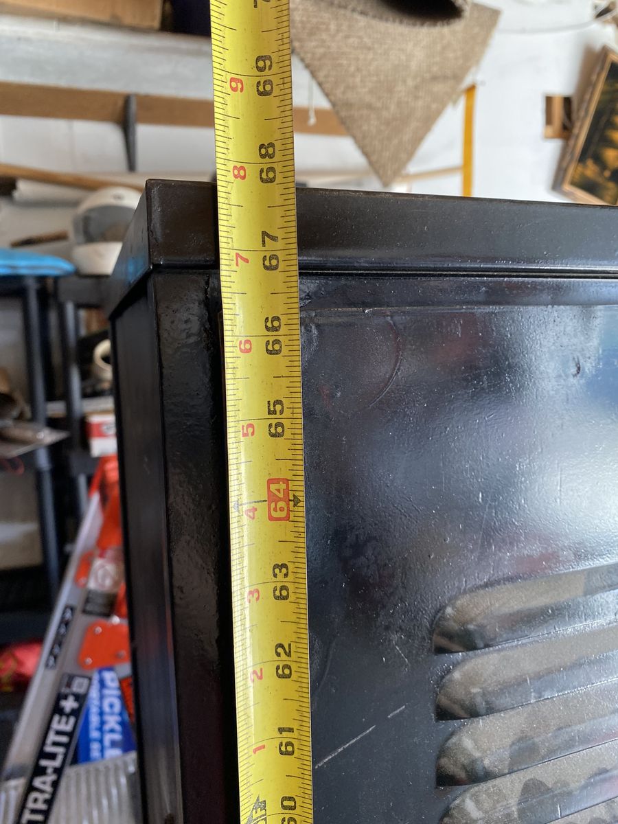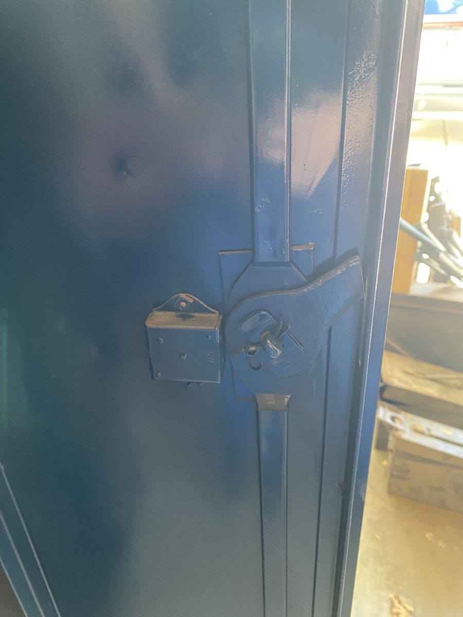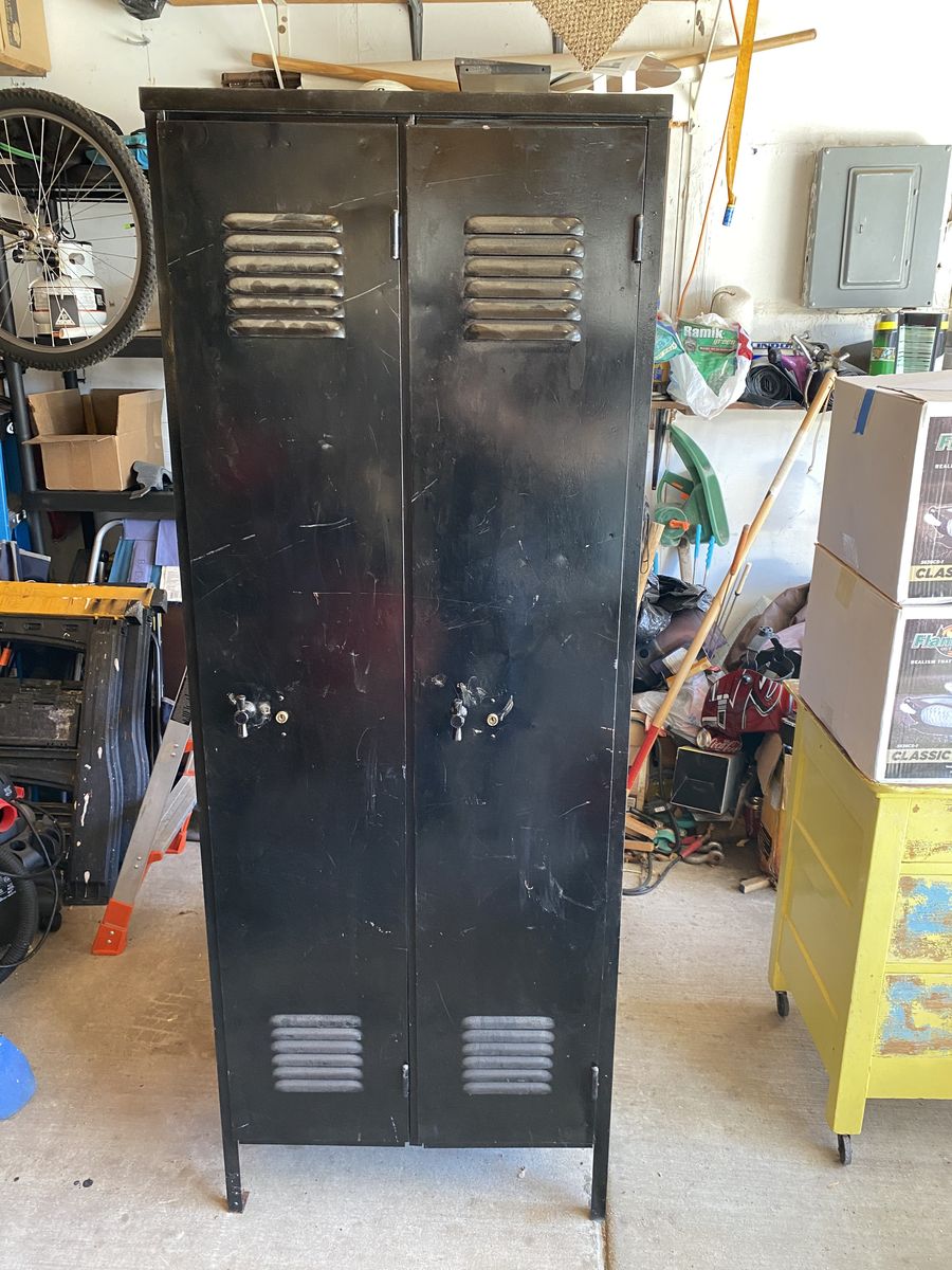 VenmoAntique locker set. Estimated build date 1930’s Doors, handles hinges work well. Original color was red. Painted black in 90’s Depth: 12”. Height: 67 3/4” width: 25 1:8”