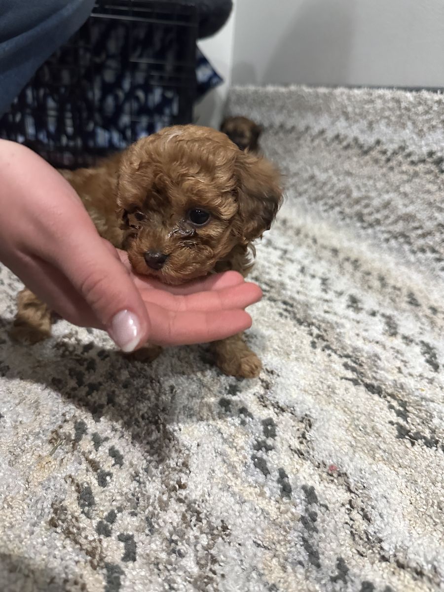 Mamma is a 9 pound half yorkie half poodle and dad is 5 pound half Yorkshire Terrier half poodle as well. You can meet them when you come visit the puppies! These puppies should end up weighing between 5 and 10 pounds. They don’t shed and they are hypoallergenic.