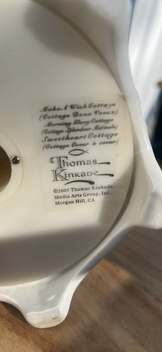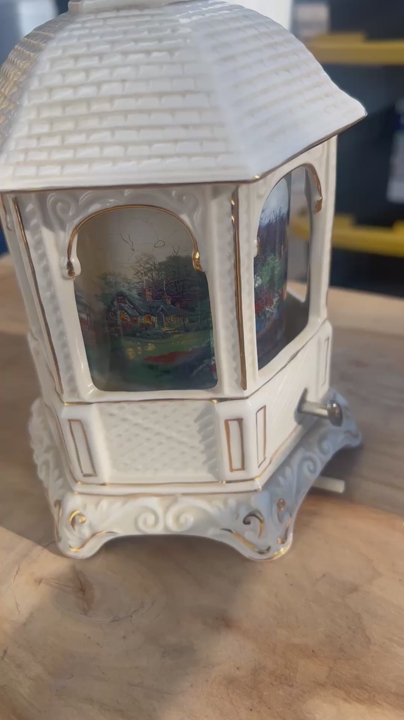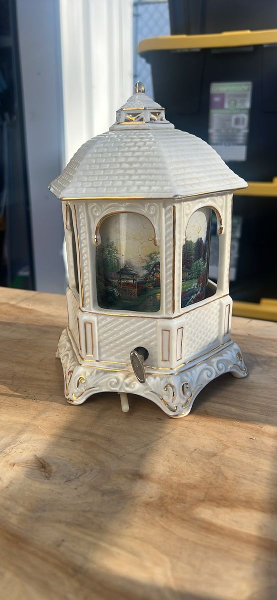 GooglePay2005 THOMAS KINKADE PORCELAIN GAZEBO ROTATING MUSICAL LIGHT COTTAGE GOLD ACCENTS