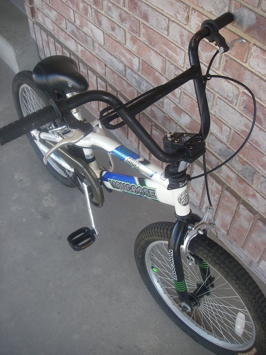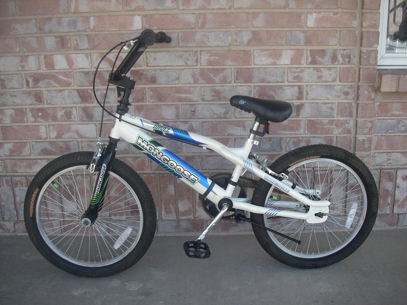 Boys 20" MONGOOSE (wheel size) GAVEL BMX / FREESTYLE Bike, Nice, Blue / White, Freewheel, Hand Brakes, Kickstand, 48-Spoke wheels. This bike is a beast! Has a long seat post that can be adjusted up for big kids. Bike is best suited for wild and crazy teenagers who like to spend a lot of time riding standing up.