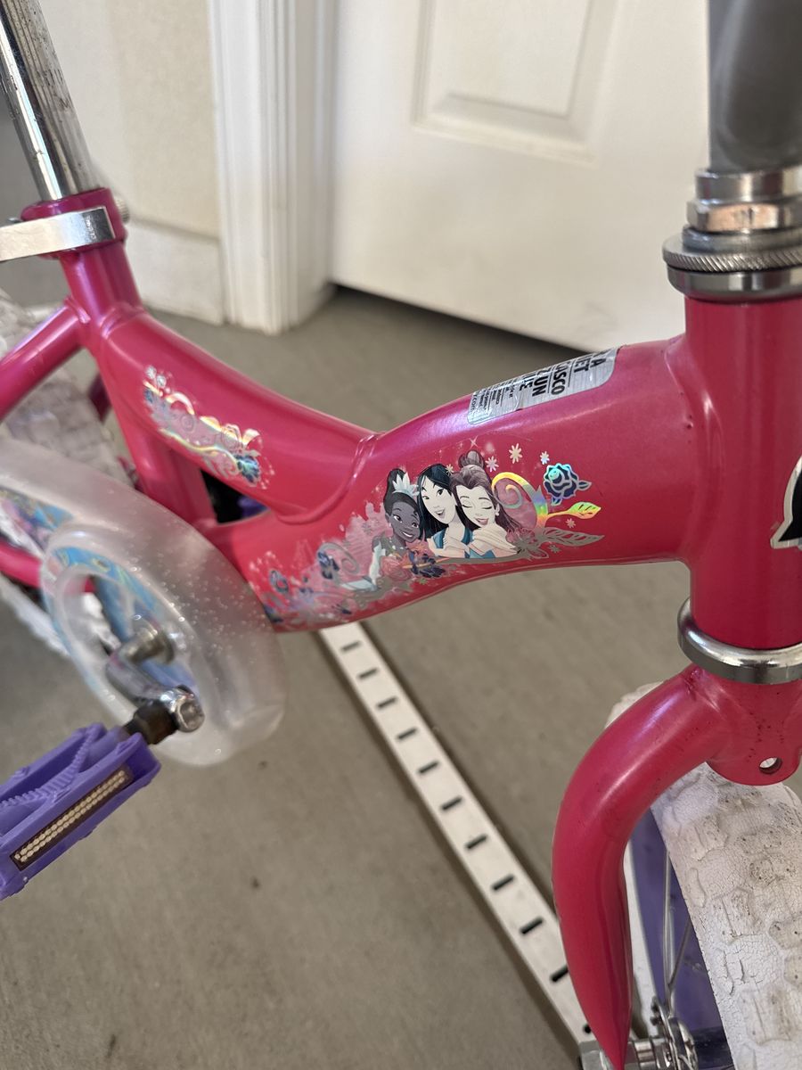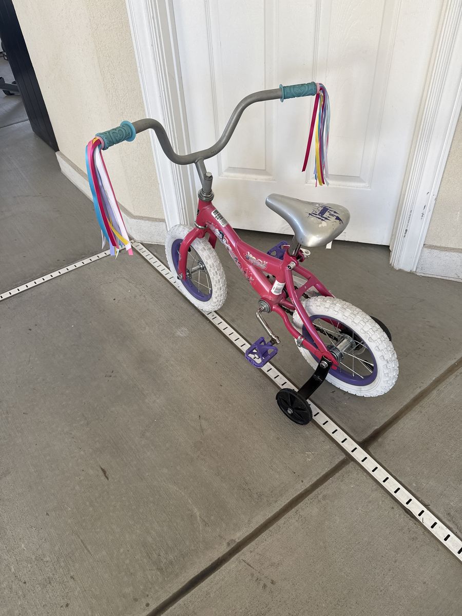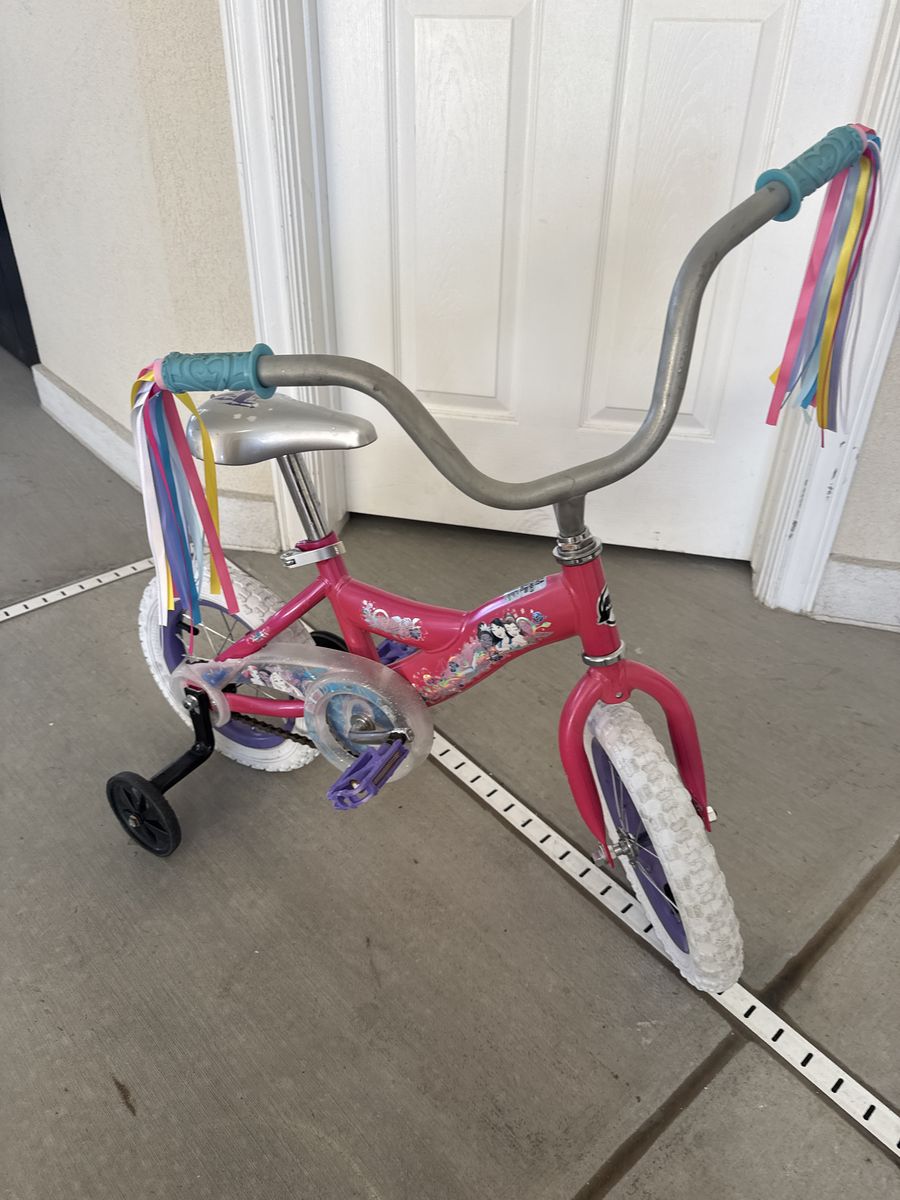 VenmoPrincesses pink 12 inch bicycle. Great wheels and pedal crank action. Ready for beginners