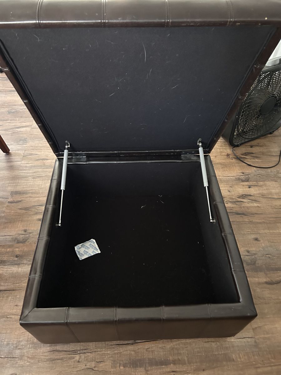 ApplePay30”x30”x17.5” Like new pleather ottoman. Dark chocolaty brown co lor. It holds quite a few blankets and pillows but obviously can be used for other things if you like. We replaced it and just don’t need it anymore.