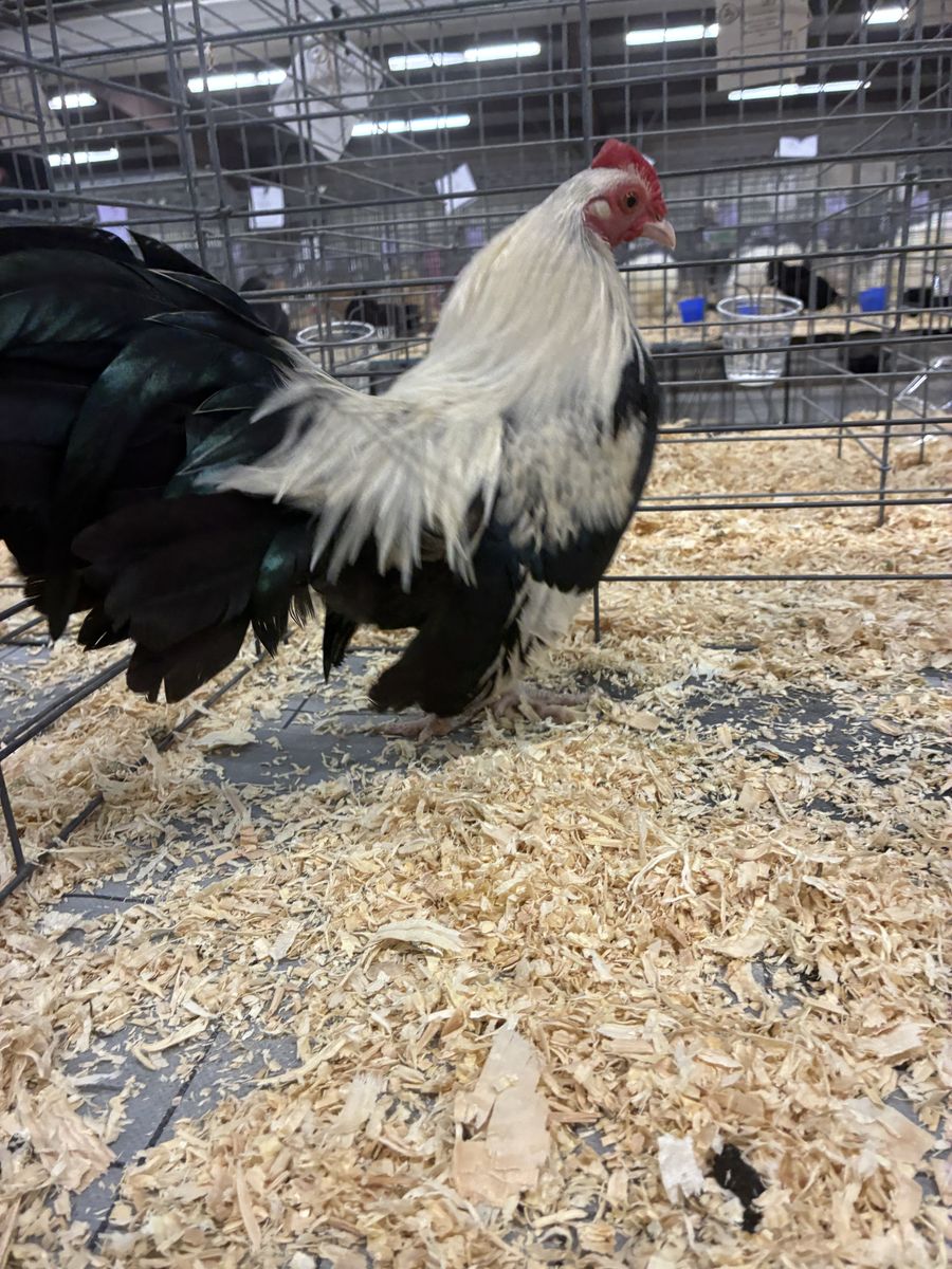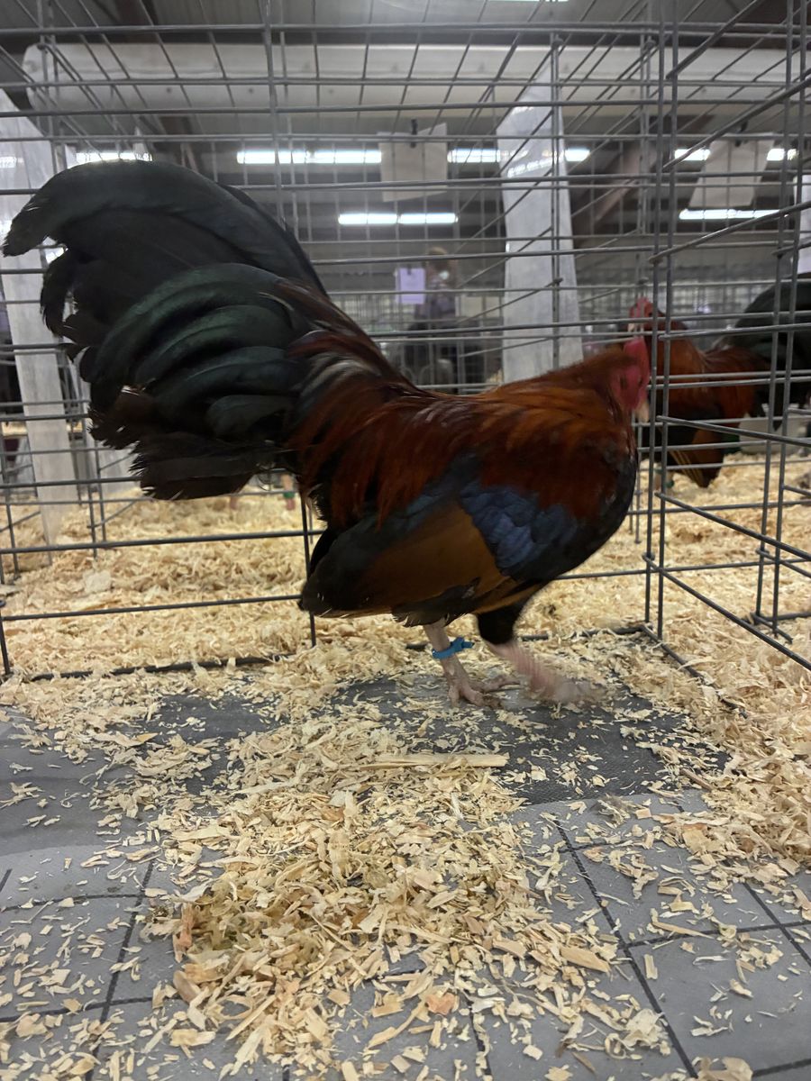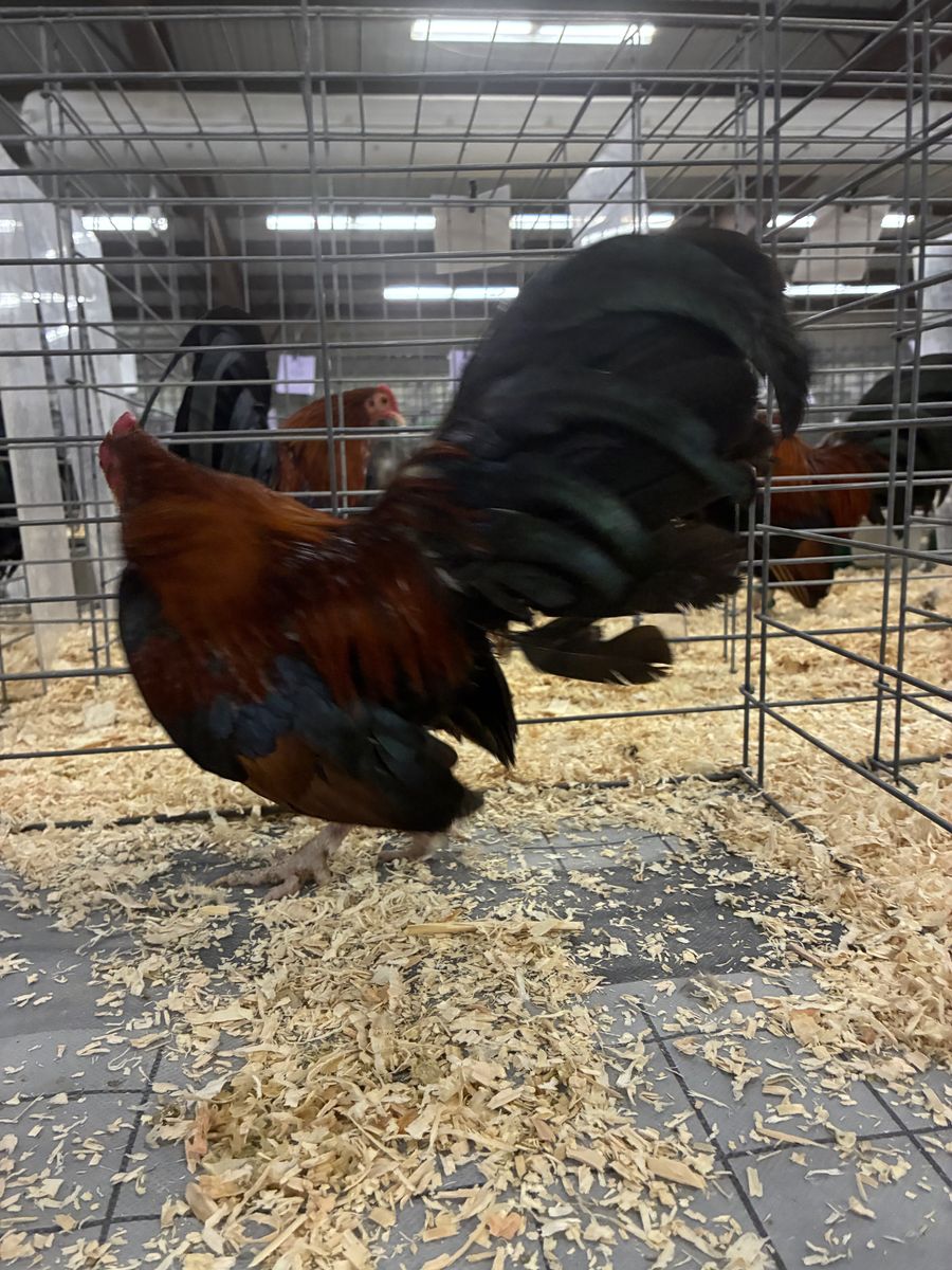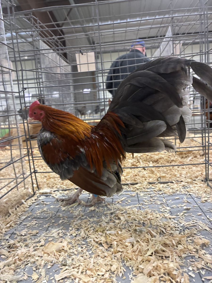Old English Game Bantams I have 2 Trios of Silver Duck Wings 1 pair BB Reds 1 Blue Red cockerel