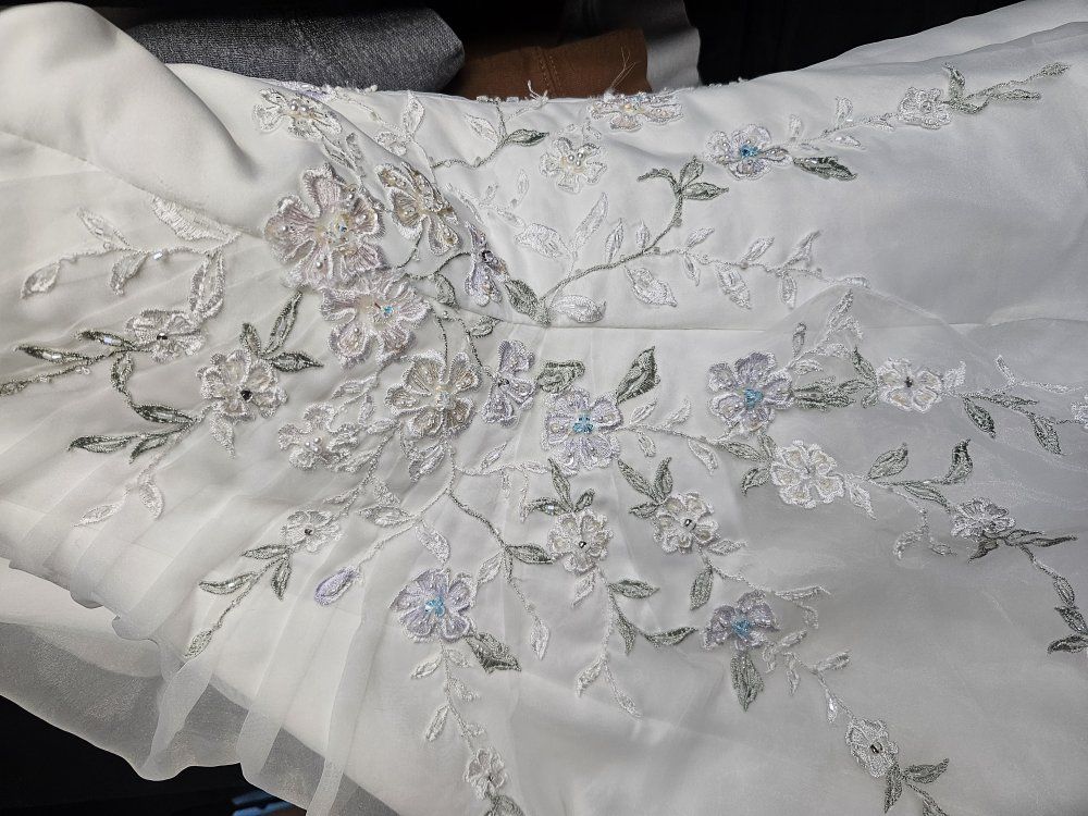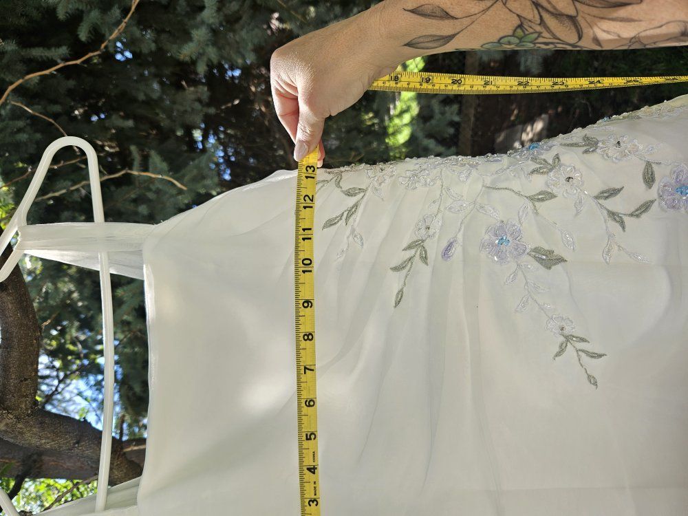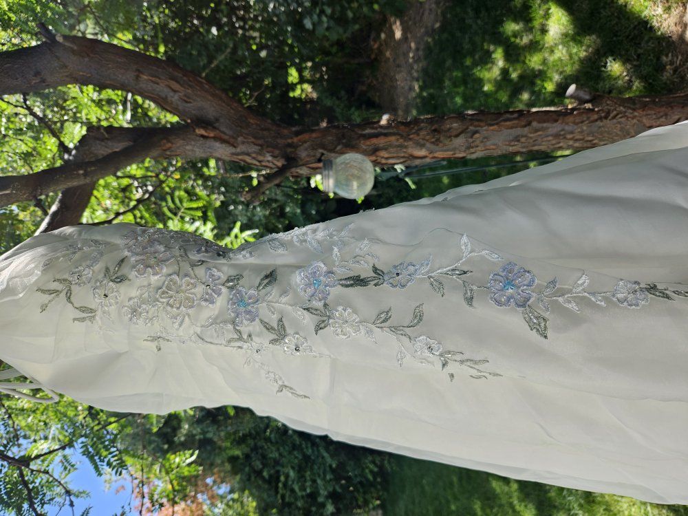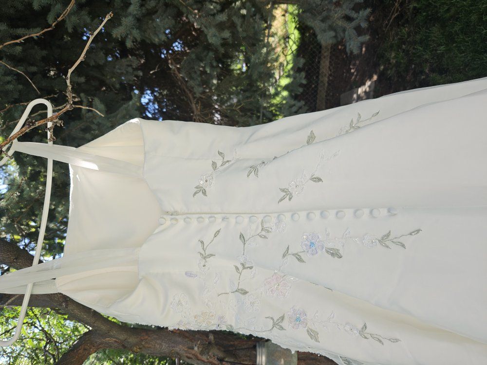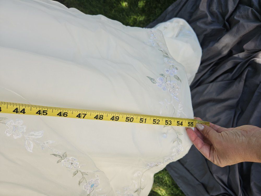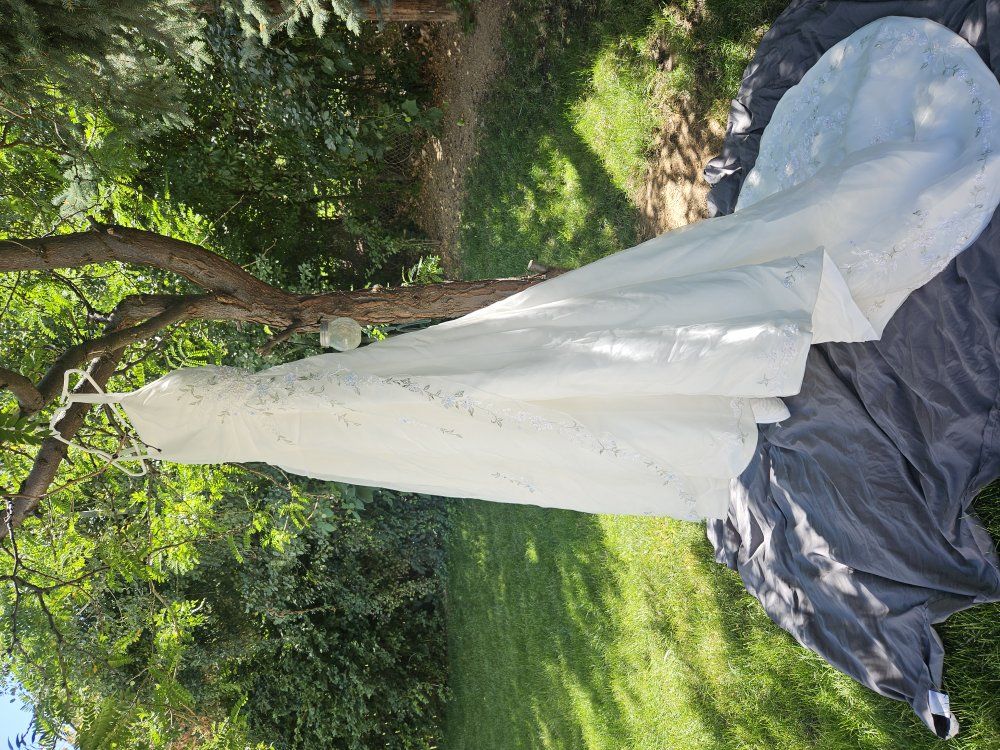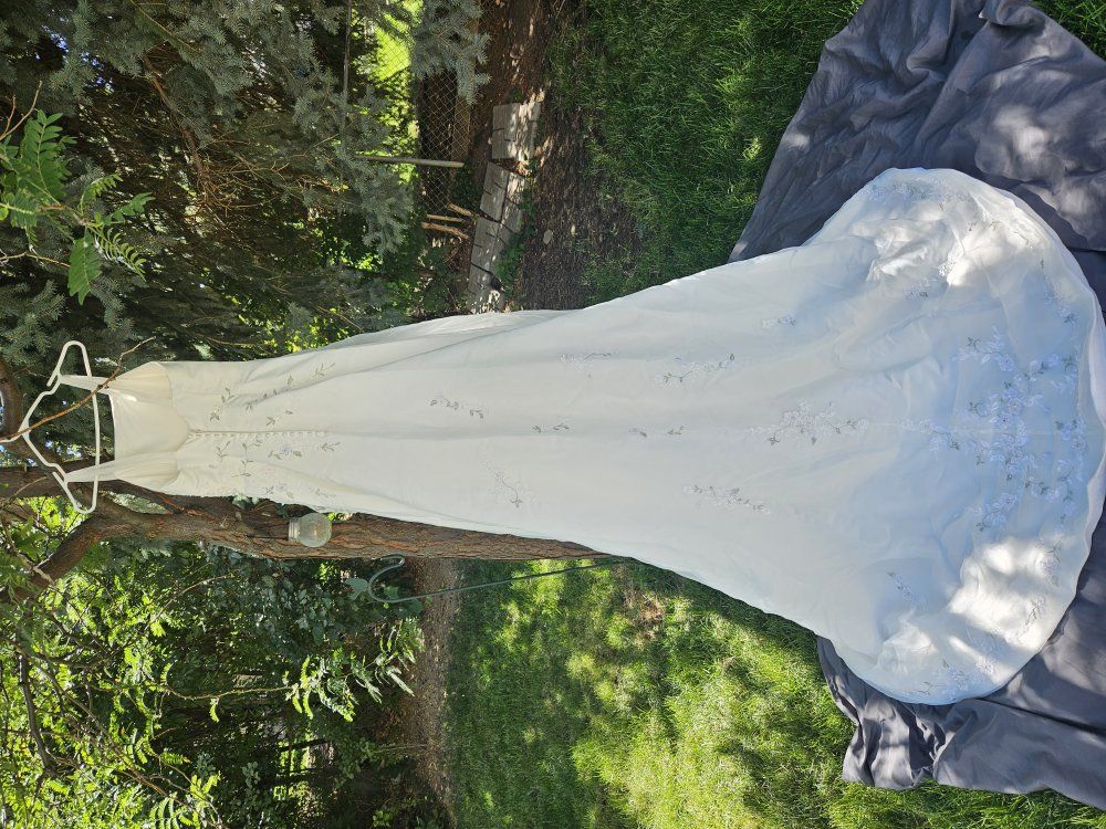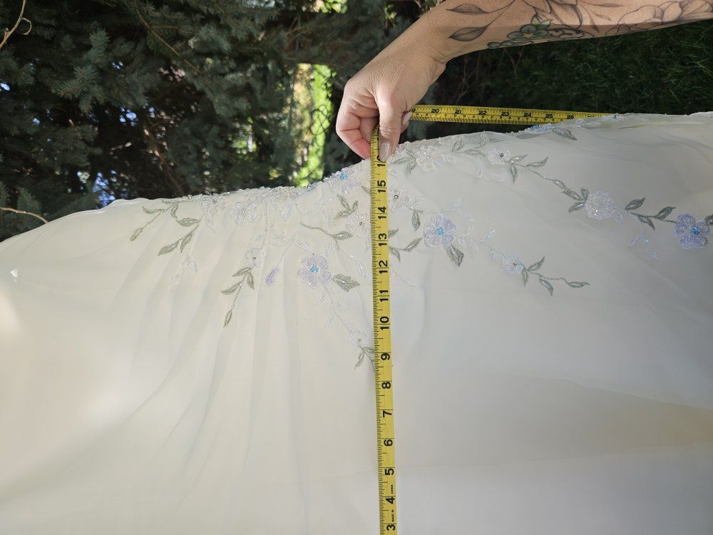 Ivory with blue beads. Worn for pictures and wedding day. After that it was professionally cleaned and boxed up. Looks brand new, recently took it out of the box to take pics to sale it. Unfortunately I dont know the size I had it taken in. I did do my best to measure it, shown on pics.