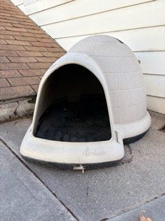Sturdy, weather-resistant large dog igloo in great condition. This shelter is designed to keep your dog comfortable year-round, with built-in ventilation for airflow and insulation to help regulate temperature.