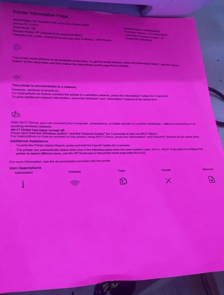 Printer Information Page Model Name: HP DeskJet 2700 All-in-One Printer series Service ID: 34343 Bonjour Name: HP DeskJet 2700 series [EE8E61] Estimated Ink Levels. Actual ink levels may vary: K-Ready, CMY-Ready Serial Number: CN48KHZNZ9 Firmware Version: TCP1FN2349DR Automatic Firmware Update: Off Printer PIN: 95979785 Visit www.hpconnected.com to manage this web-connected printer. To print additional network information, press the Wireless* and Information* buttons at the same time. With Wi-Fi Direct, you can connect your computer, smartphone, or tablet directly t o a printer wirelessly.