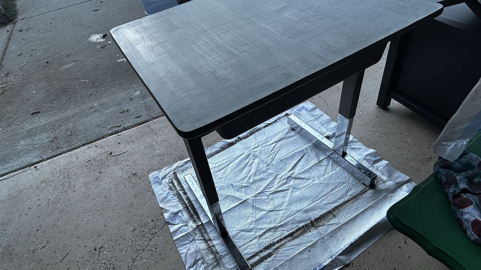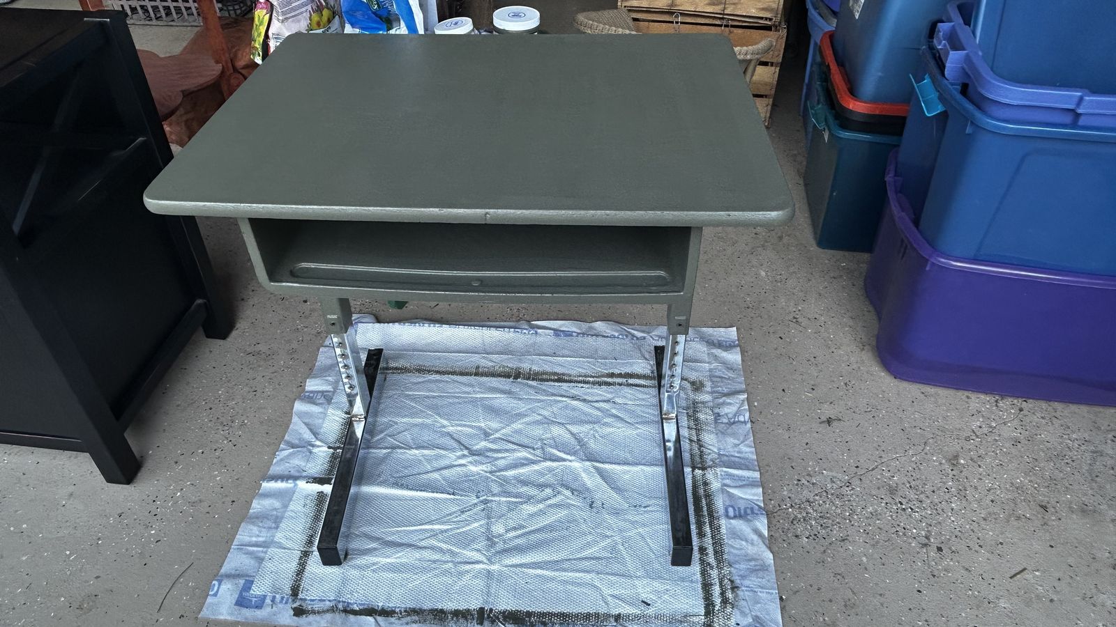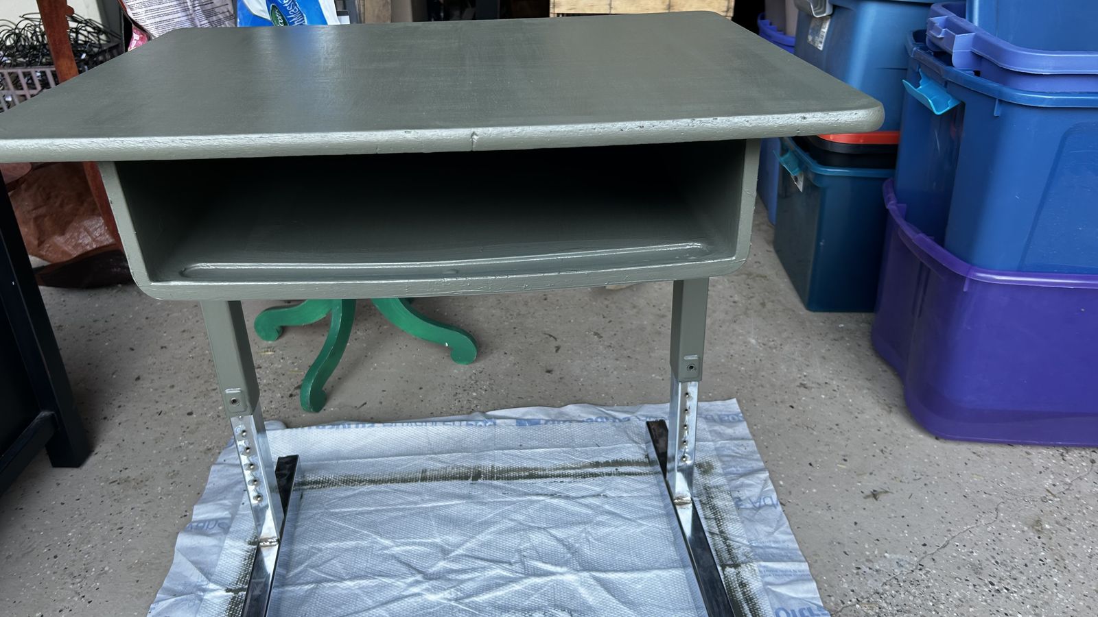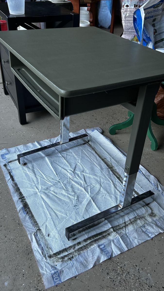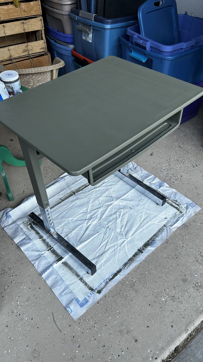 This is an old vintage school desk - freshly painted an earthy moss green. Measures about 27” tall x 26” wide x 20” deep. Cash at pick up in Highland.