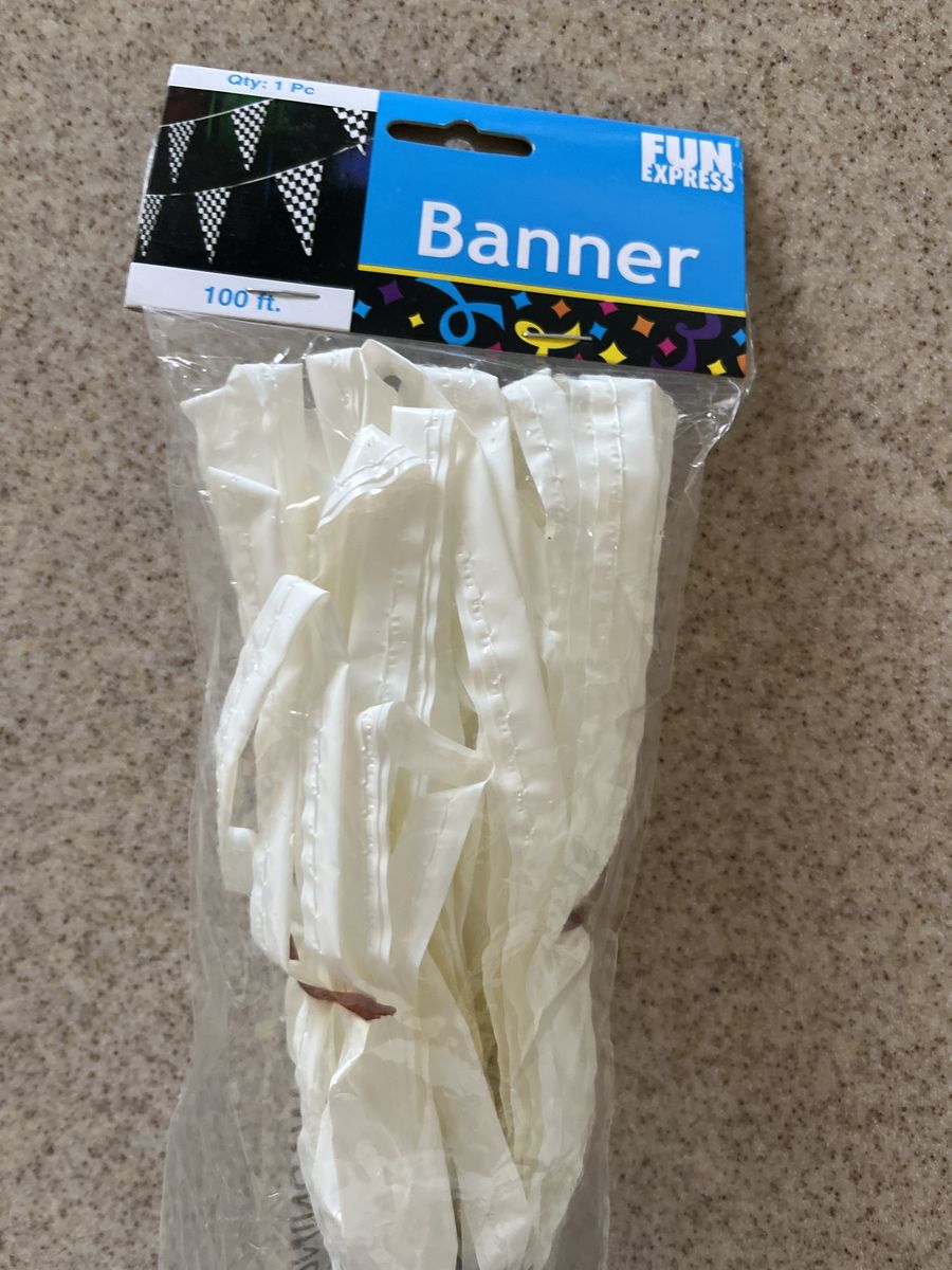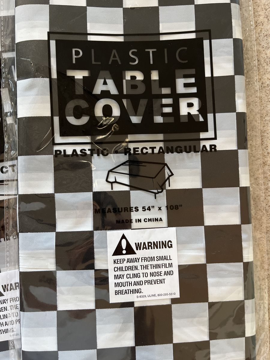 All brand new! Banner is 100 feet Plastic Table cloths 54”x108”