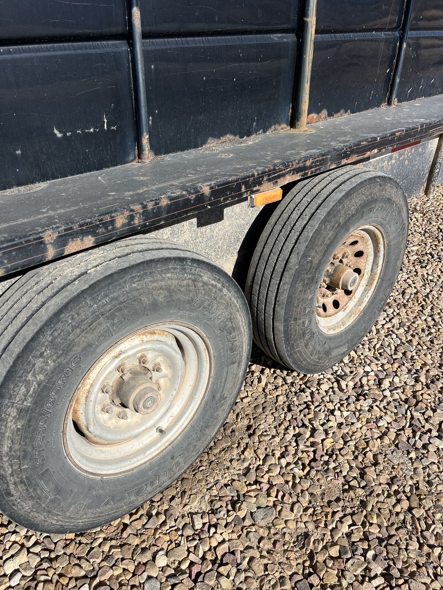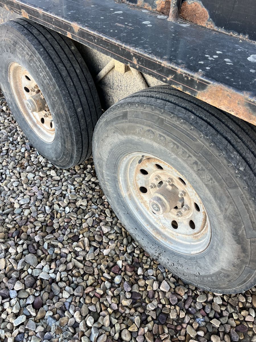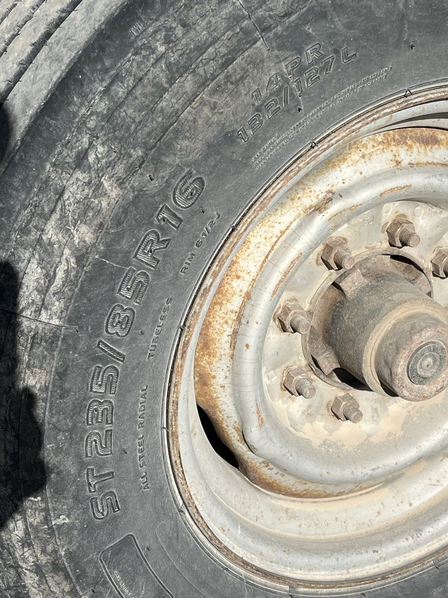 Trailer has good tires all the way around, 14 ply load-range G and a spare tire that will get you home. Sturdy floor, and rubber mats (included); rear mat does have a hole in it. Center gate is spaced 12' up front and 8' on the back.