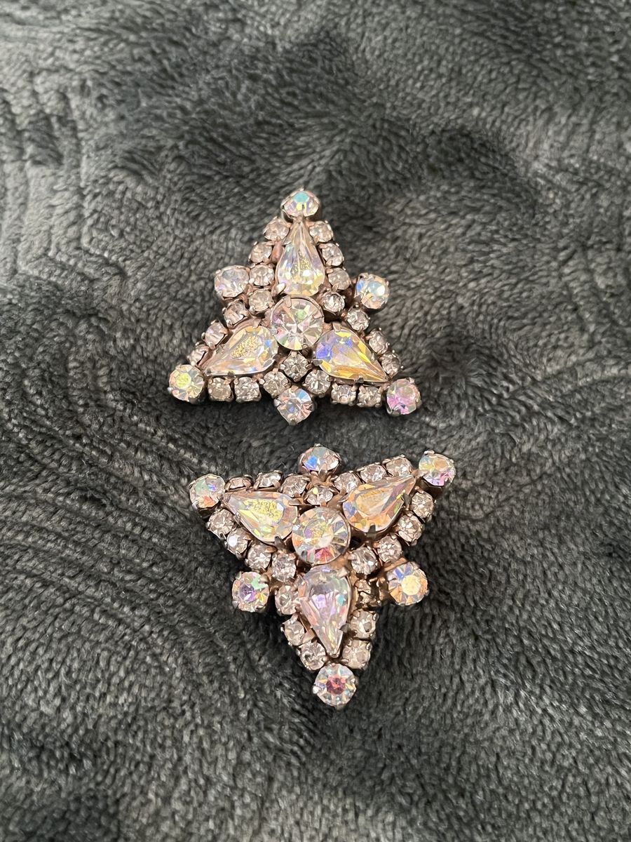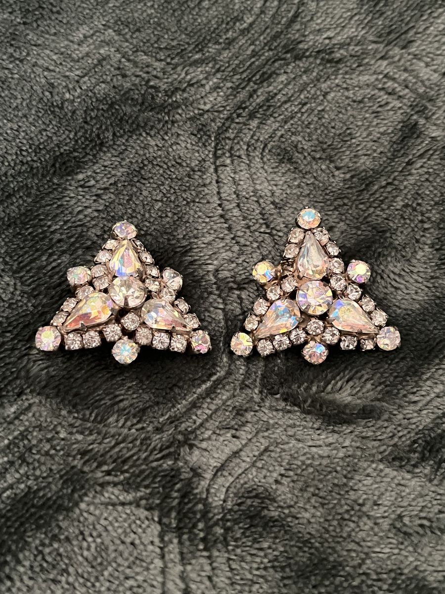 VenmoThese are from the 1950's and they are stunning! These are in excellent condition and they sparkle. There are so many vibrant colors in the four different stones. These have a retro glam look to them. The shape is a triangle that measures 1 1/2 inches across. They are set in a prong setting giving them a secure and elegant look. They are marked 'La Roca' on the back of the earrings. These are a timeless treasure to be enjoyed for many, many years. Price is firm.