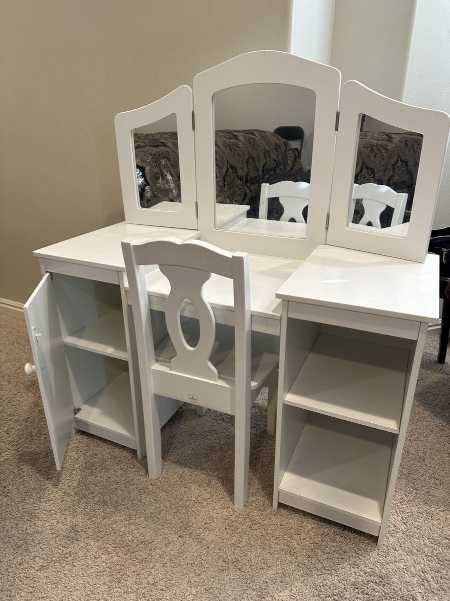 Designed for imaginative play as well as keeping things organized, this is the perfect first vanity set for your child. Sturdy wooden construction with matching chair will work in almost any room you put it in. Large acrylic mirror with adjustable sides makes it easy to do hair or makeup. The shelves are great for storing whatever you need: makeup, brushes, clothes, toys or any other precious treasures your child might have. First two pictures stock photo of the items, the rest are the photos are what you would be purchasing. Dimensions are: *Vanity dimensions: 41(L) × 16(W) × 46(H) *Chair dimensions: 14(L) × 14(W) × 28(H) *Seat height: 14 *Weight: 48 lbs
