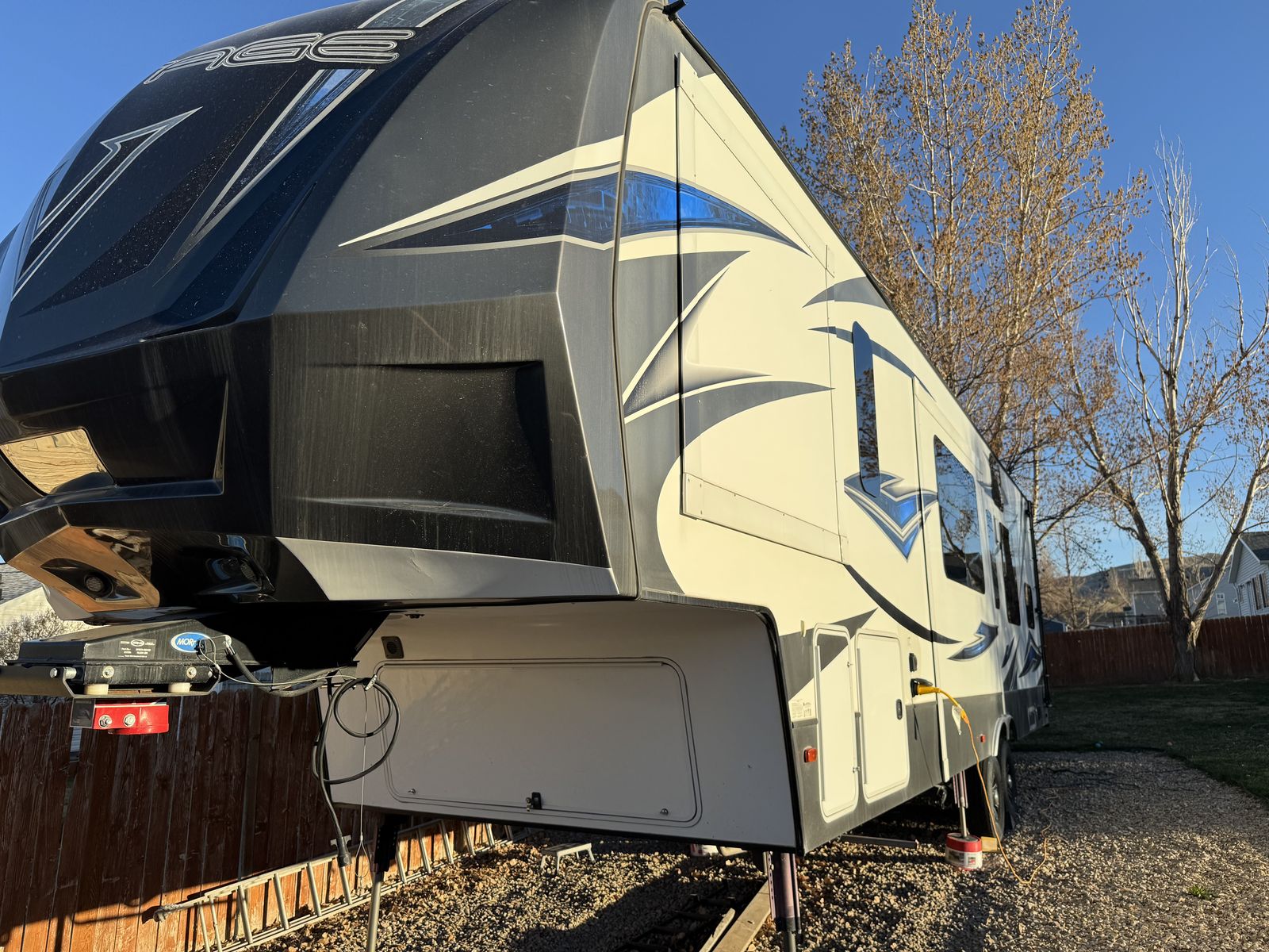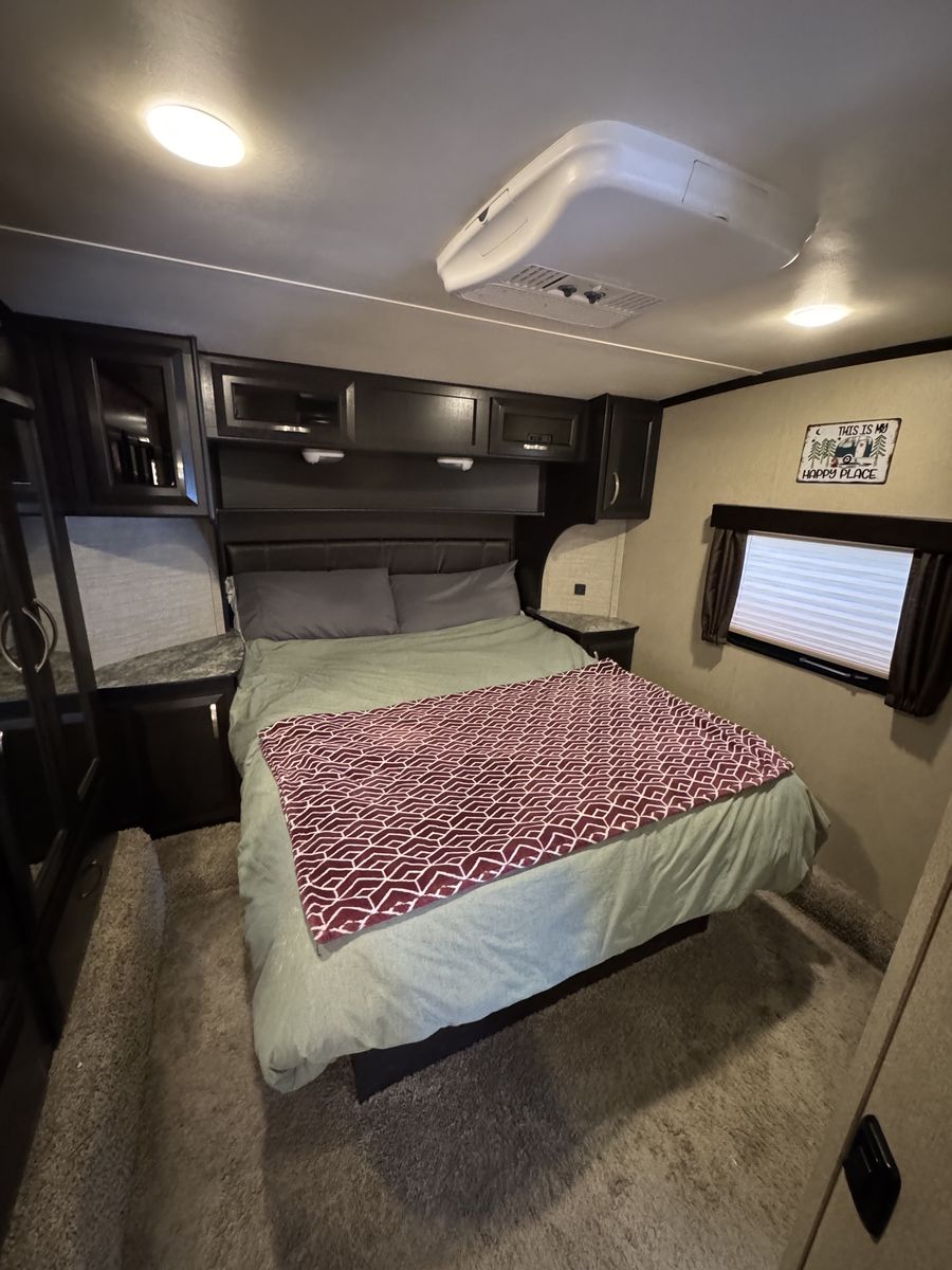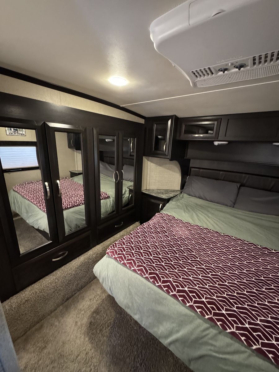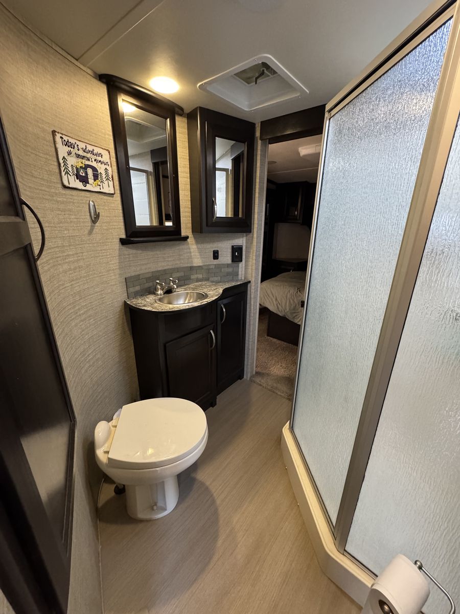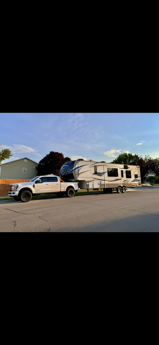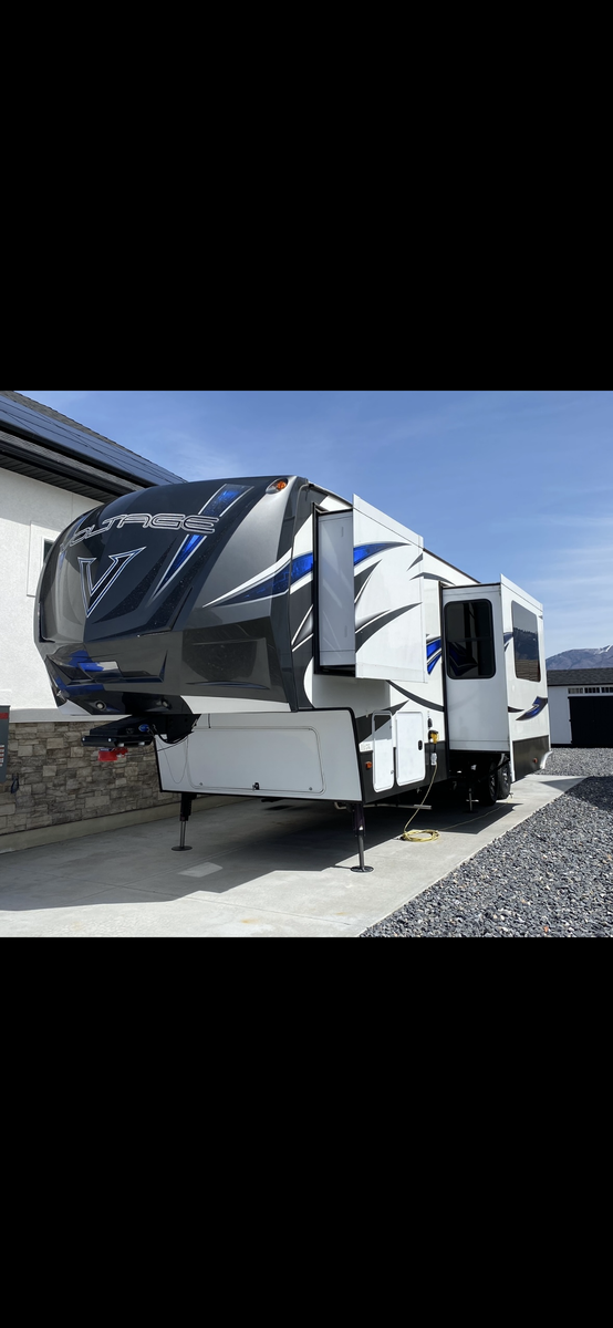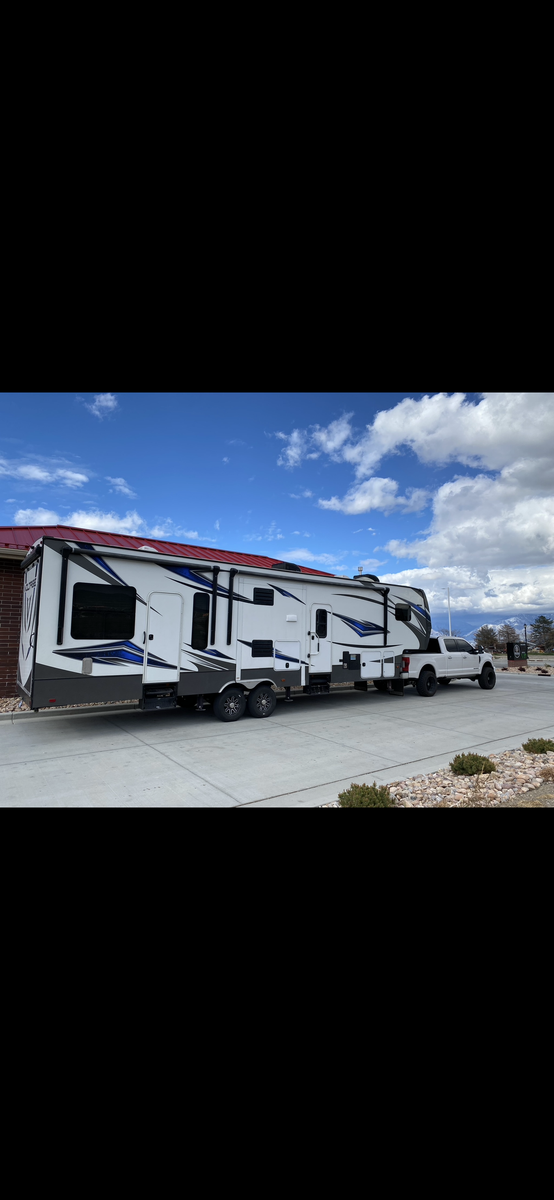 This trailer is in great shape and has been well taken care of. Washed after every trip and everything works on the trailer. It is the blue and gray edition that you don't see very often. All the slide motors work as they should, water pump is new, A/C's blow cold, fireplace blows nice and hot and the furnace works great. We have owned this trailer for 4 years and it's been great for us. We shortened the couch so we could put the baby bassinet there. You could use the extra space for whatever really. Tires are probably half warn and they are the Sailun 14ply tires. The garage is 12.5 and fits my RZR turbo S on 35's. 100 gallon fresh water and 10 gallon water heater. The Sides still have a sheen on them and the front cap isnt sun damaged at all. Im sure I'm forgetting something. Text or message me with any questions.